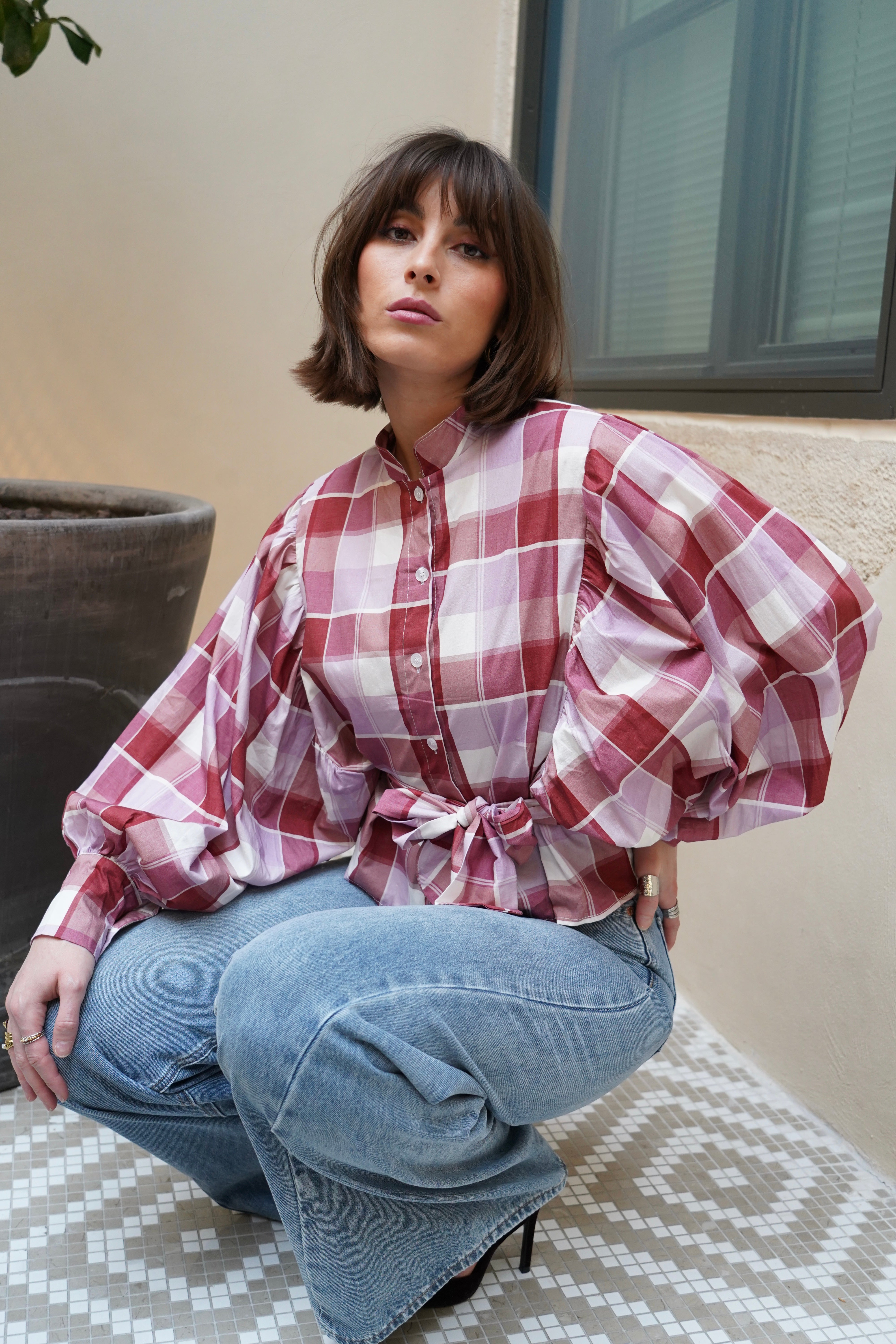 Blouse à carreaux rose et rouge