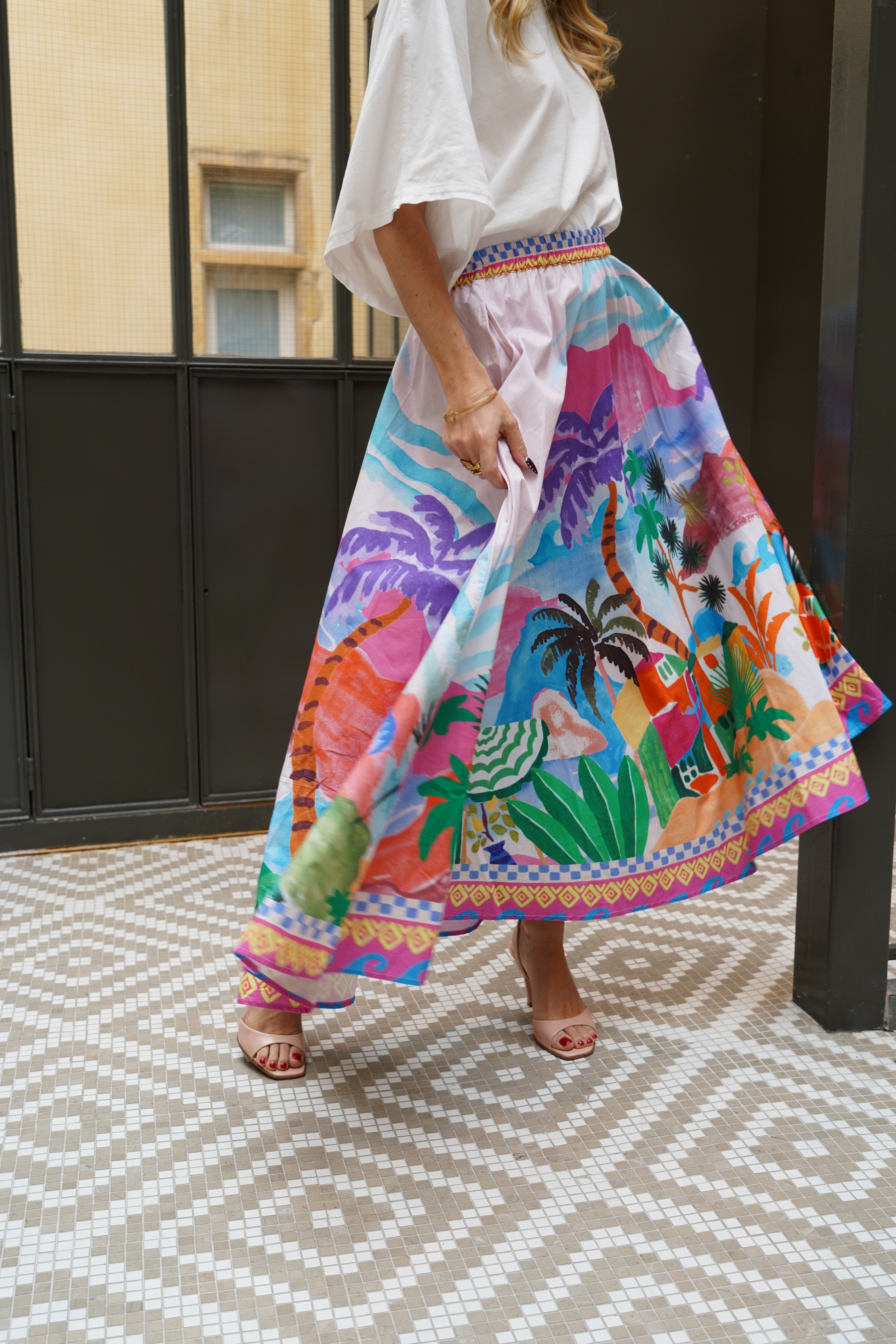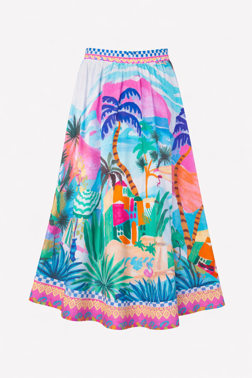 Motif coloré avec palmiers, végétation et maisons ensoleillées