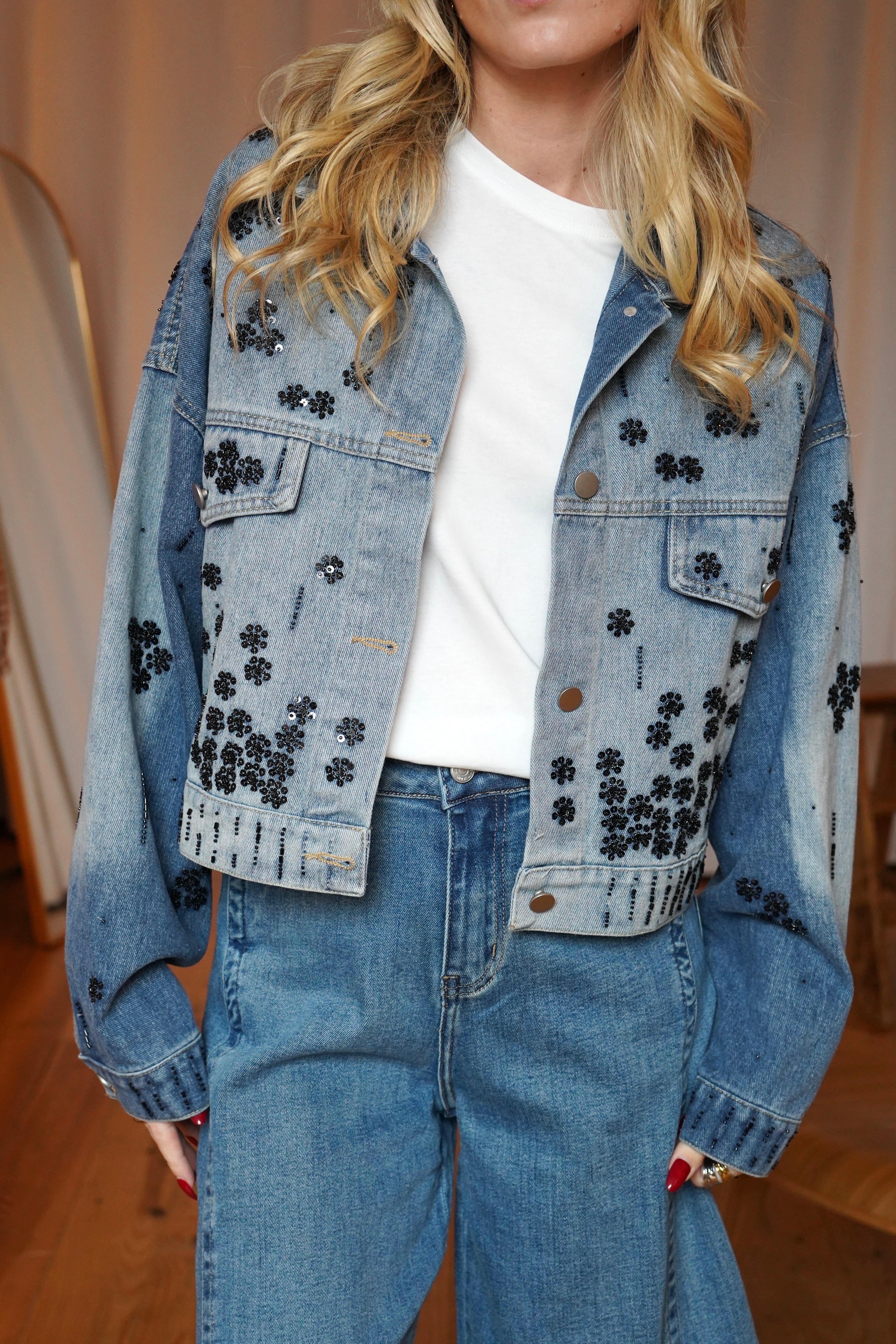 Faded blue denim jacket adorned with raised embroidered flowers. Straight, slightly cropped cut for a structured yet comfortable silhouette. Shirt collar, metal button fastening, and patch chest pockets.
