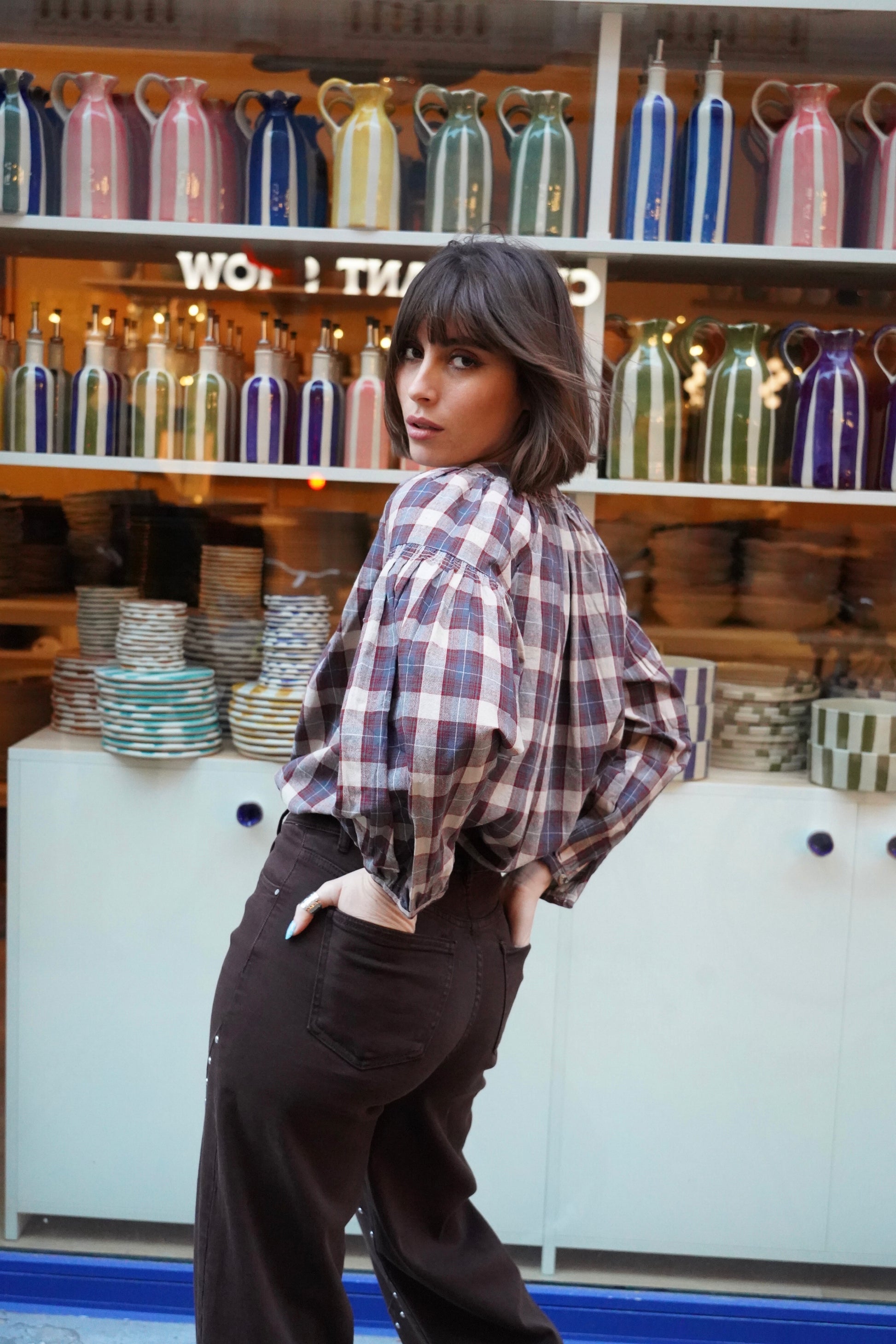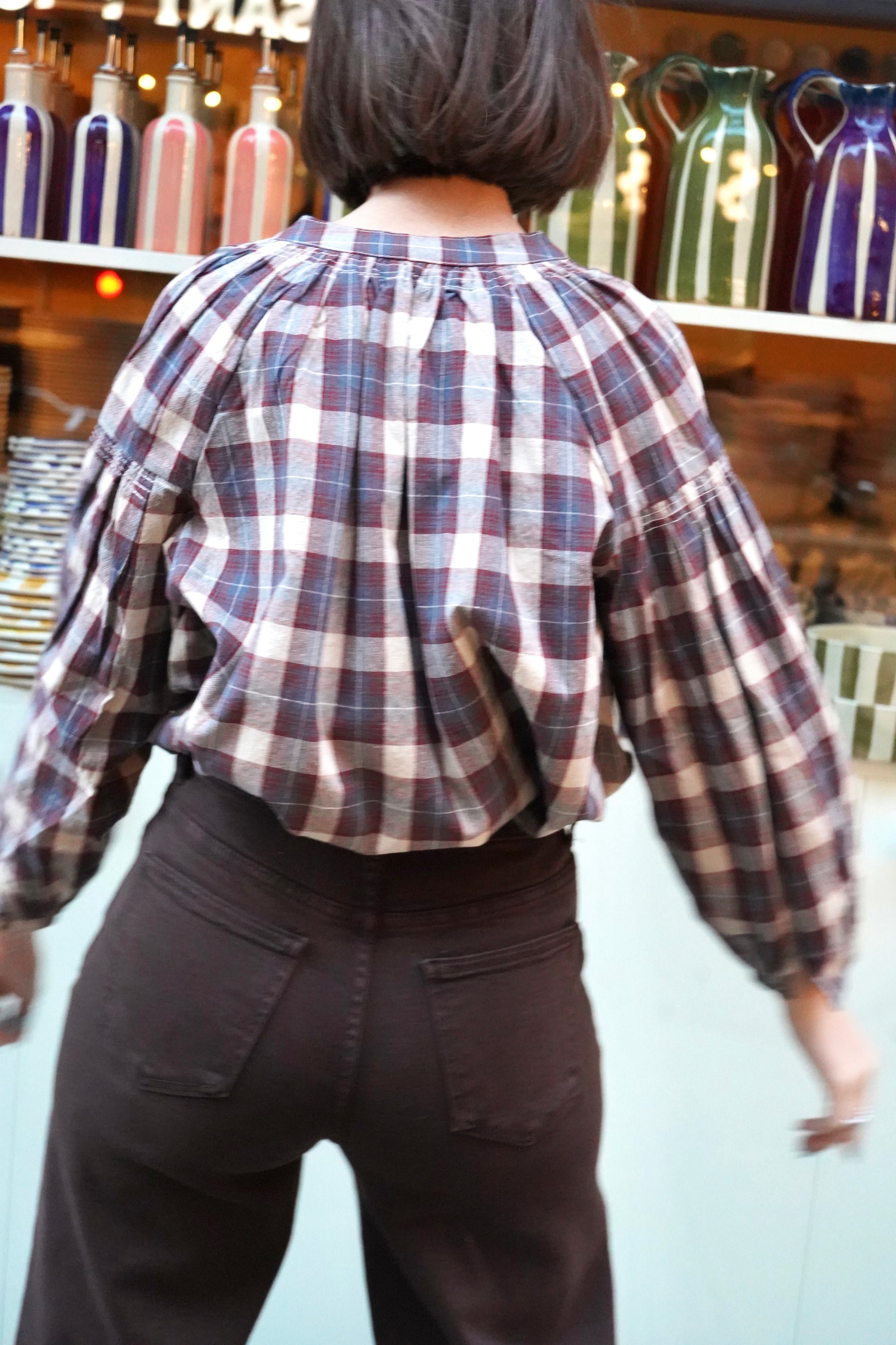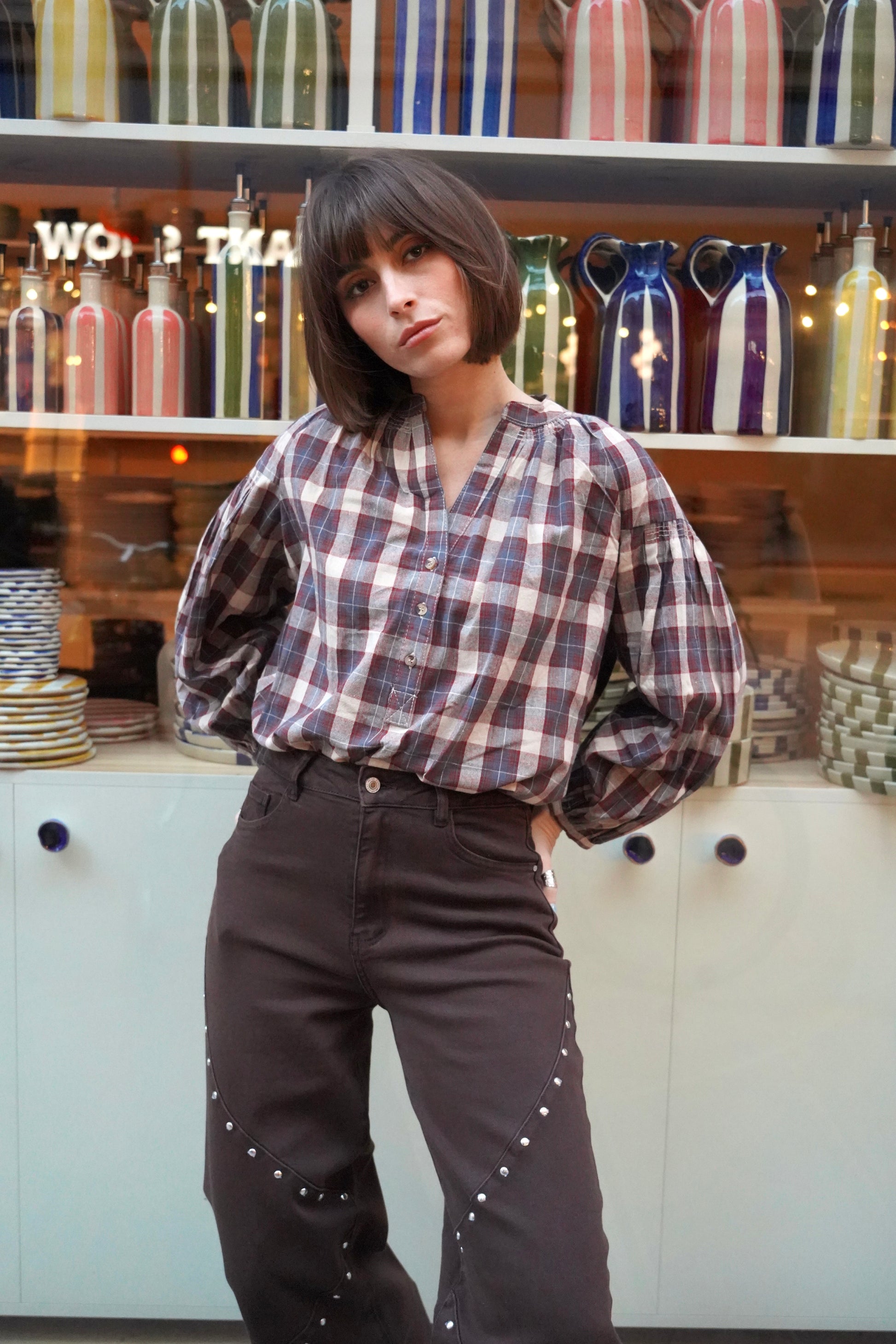 • Checkered blouse in warm tones: beige, burgundy and a touch of blue