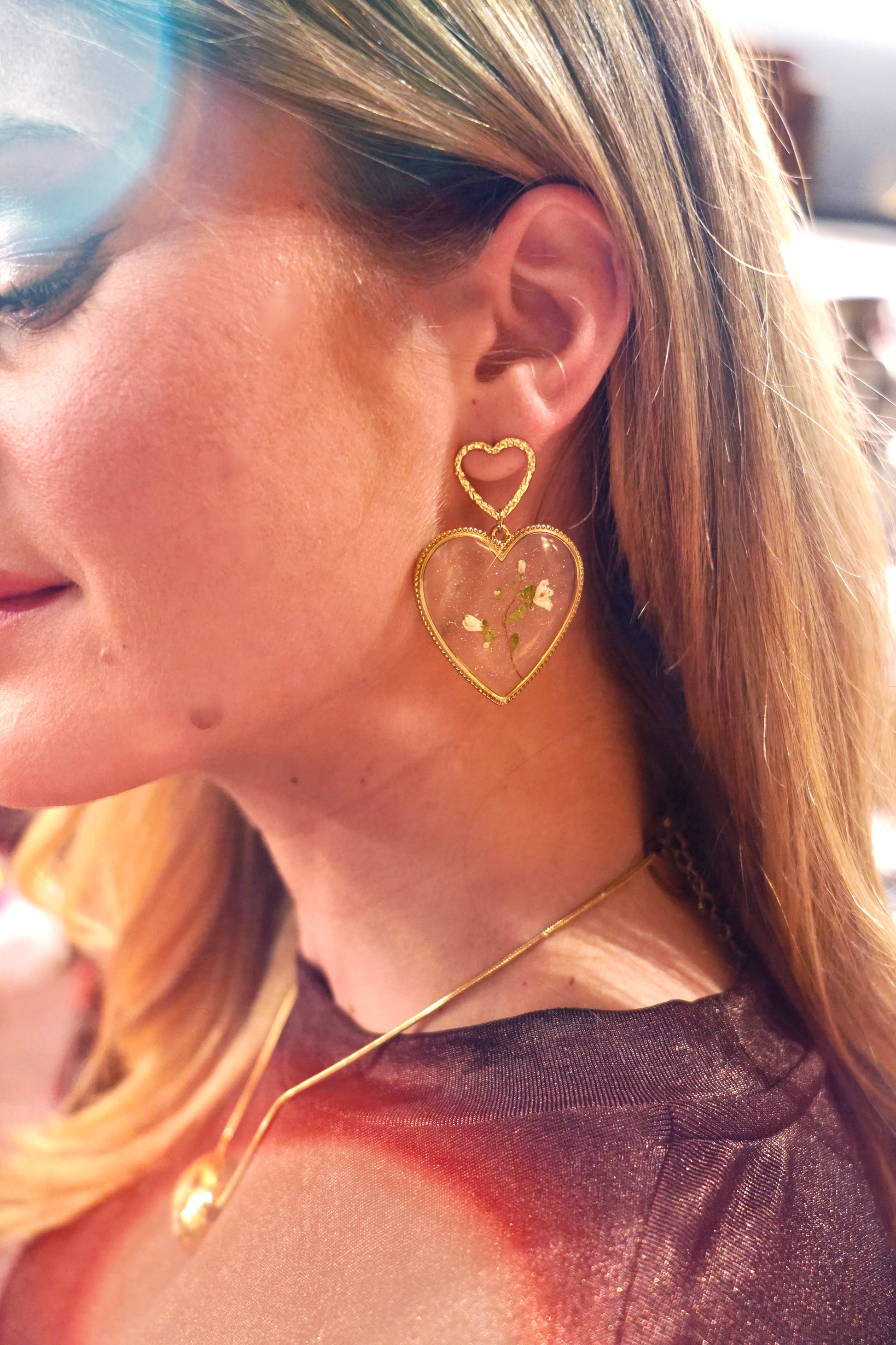 • Intérieur du cœur rempli de petites fleurs séchées incluses dans une résine claire