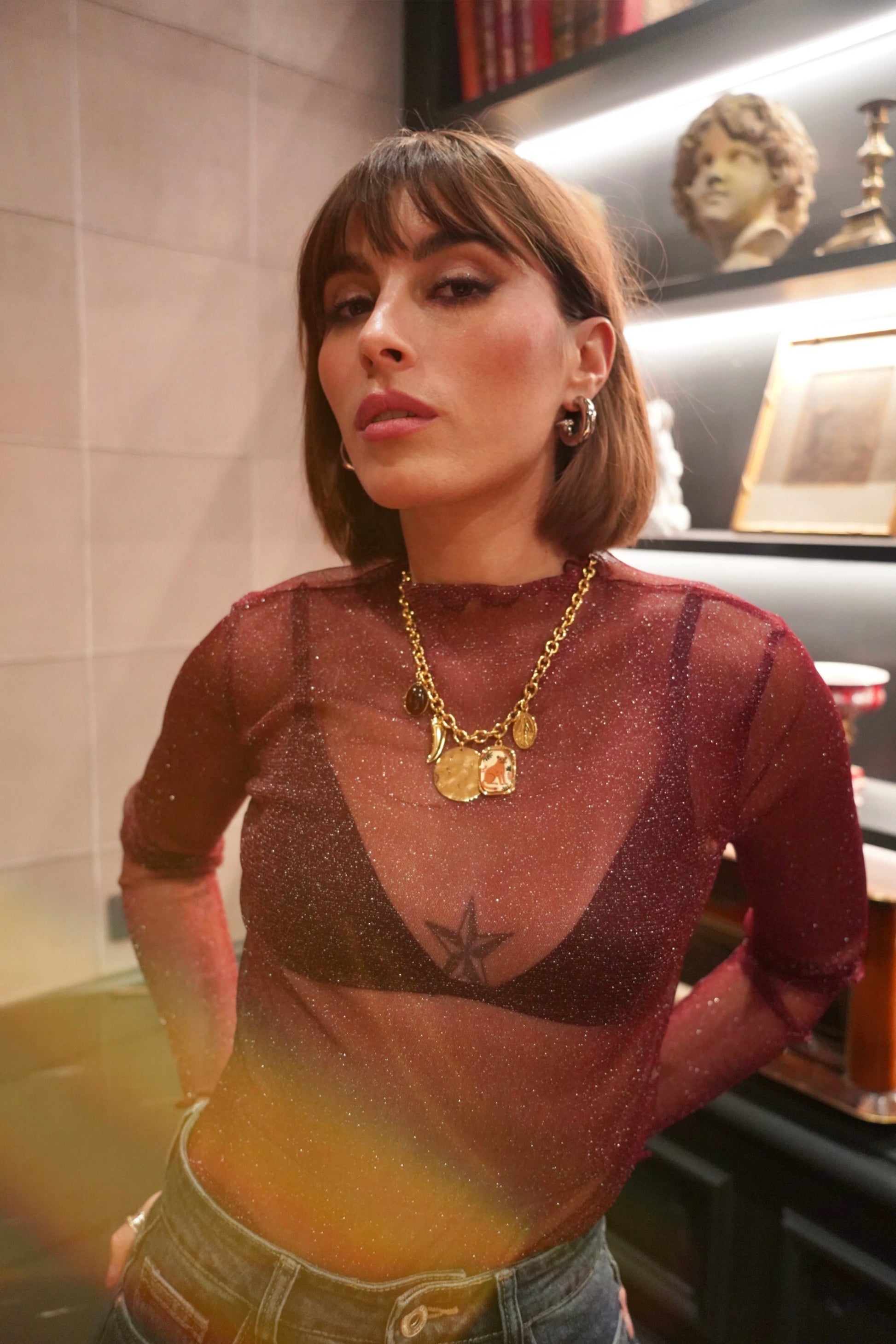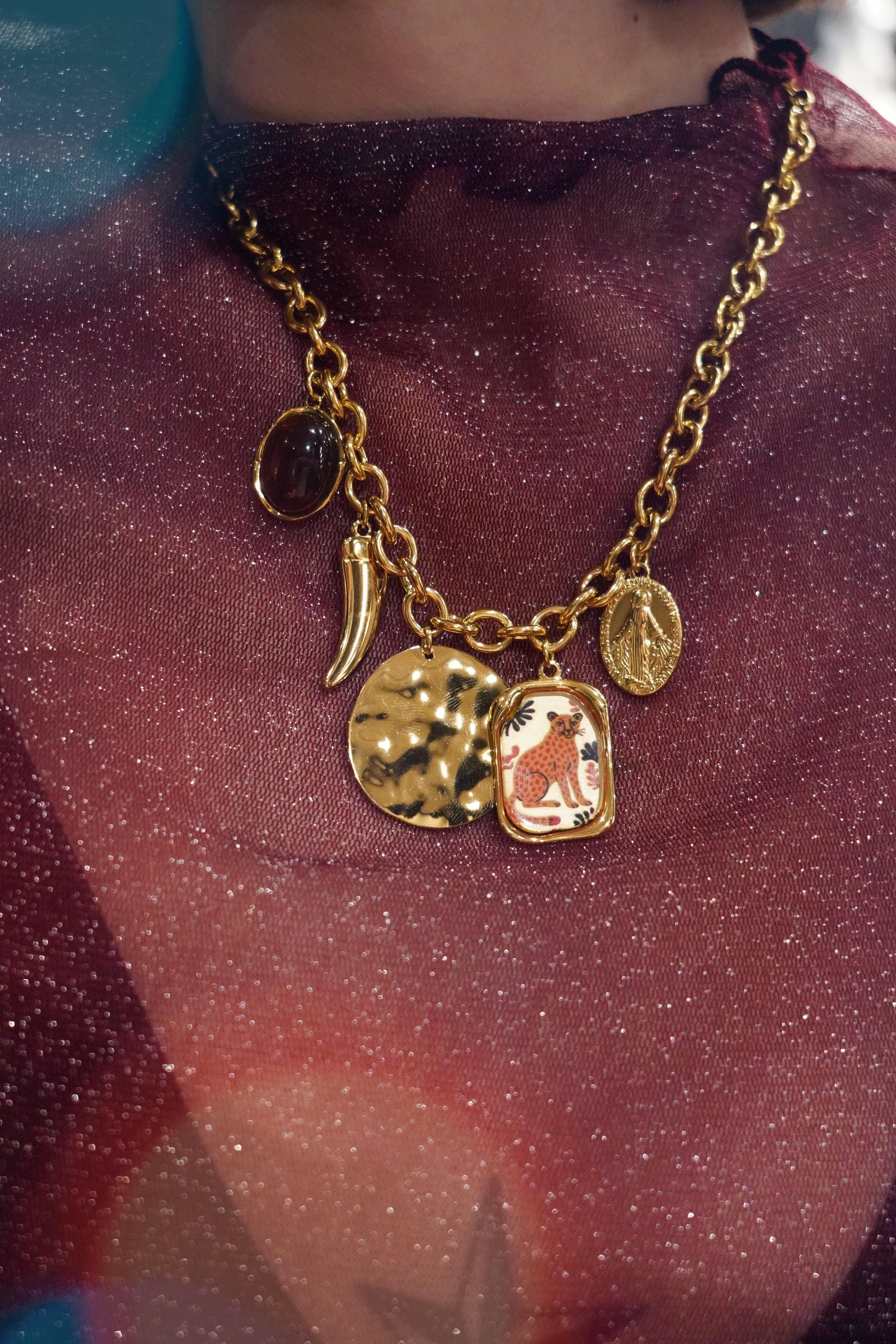 • Orné de plusieurs pendentifs : une médaille, un charm rond martelé, un pendentif piment doré, une pierre ambrée, un charm léopard