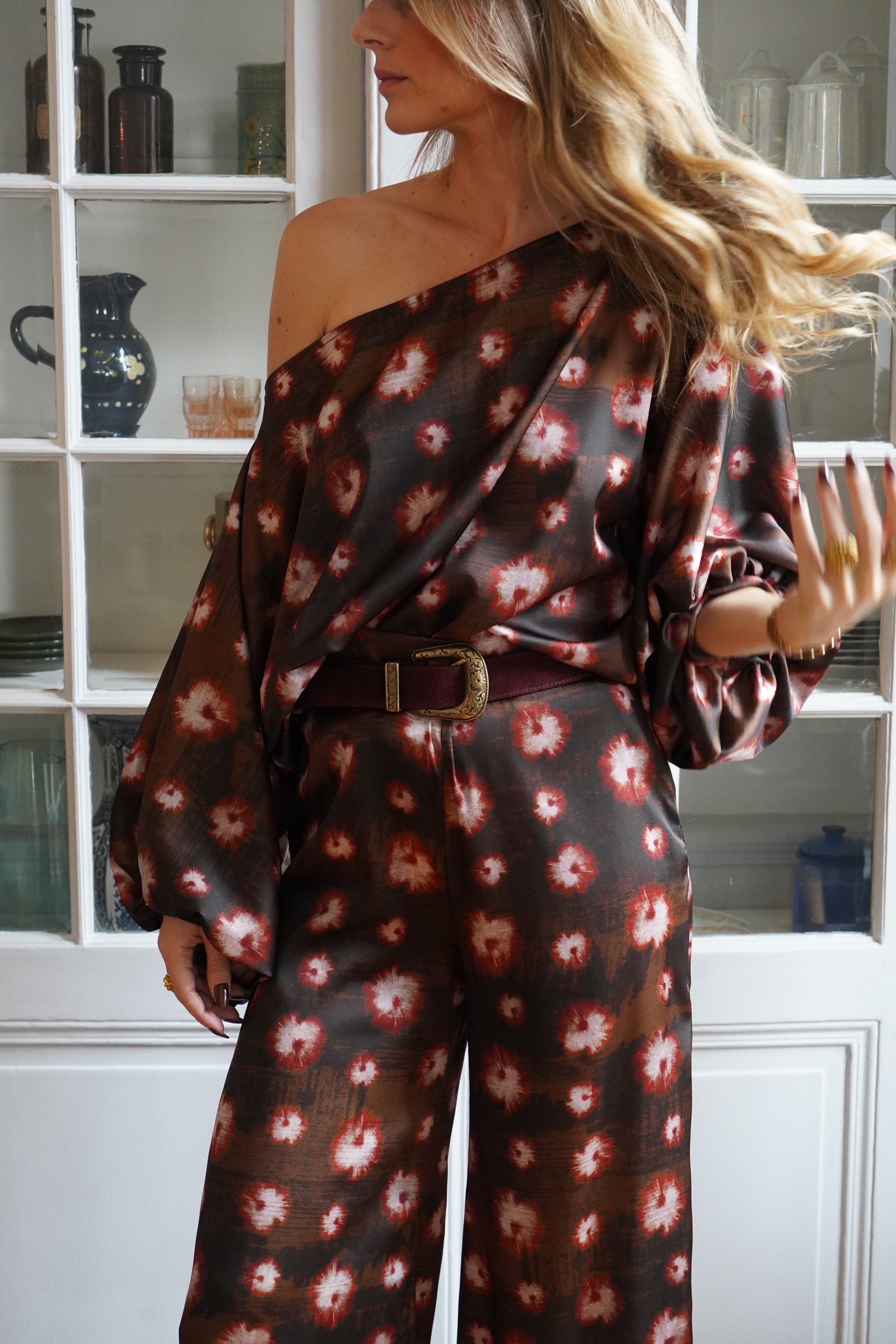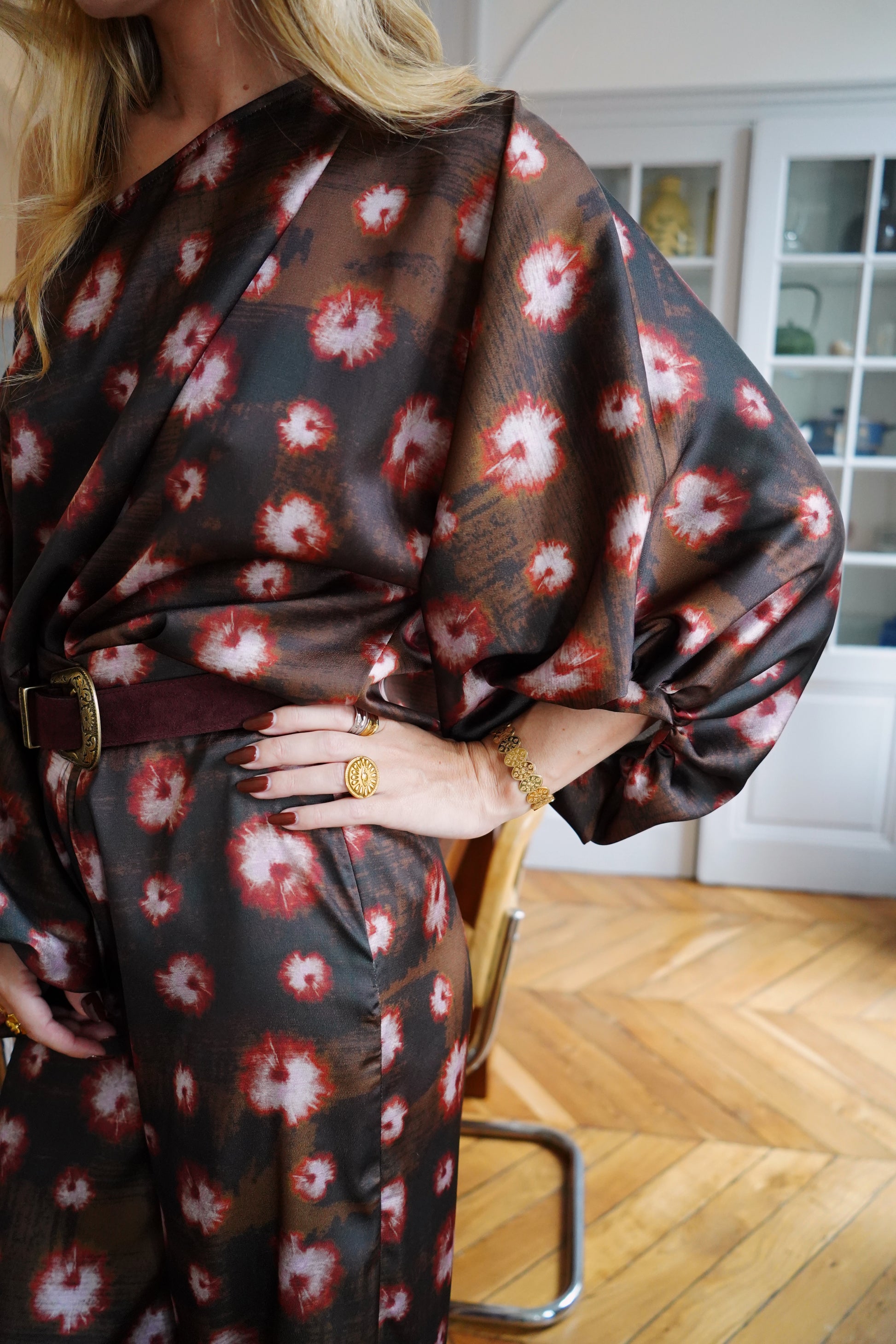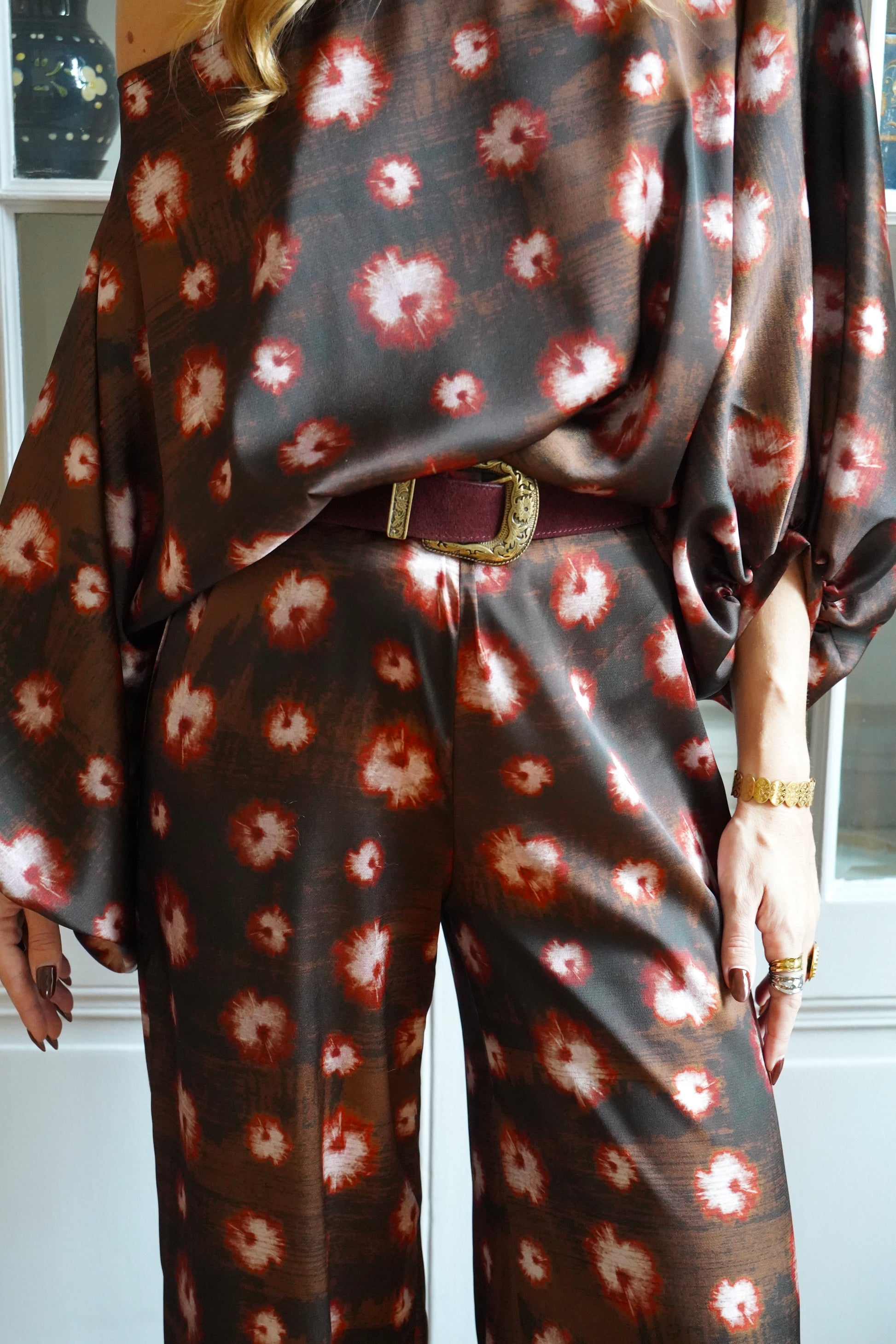• Tissu satiné imprimé brun/rouge