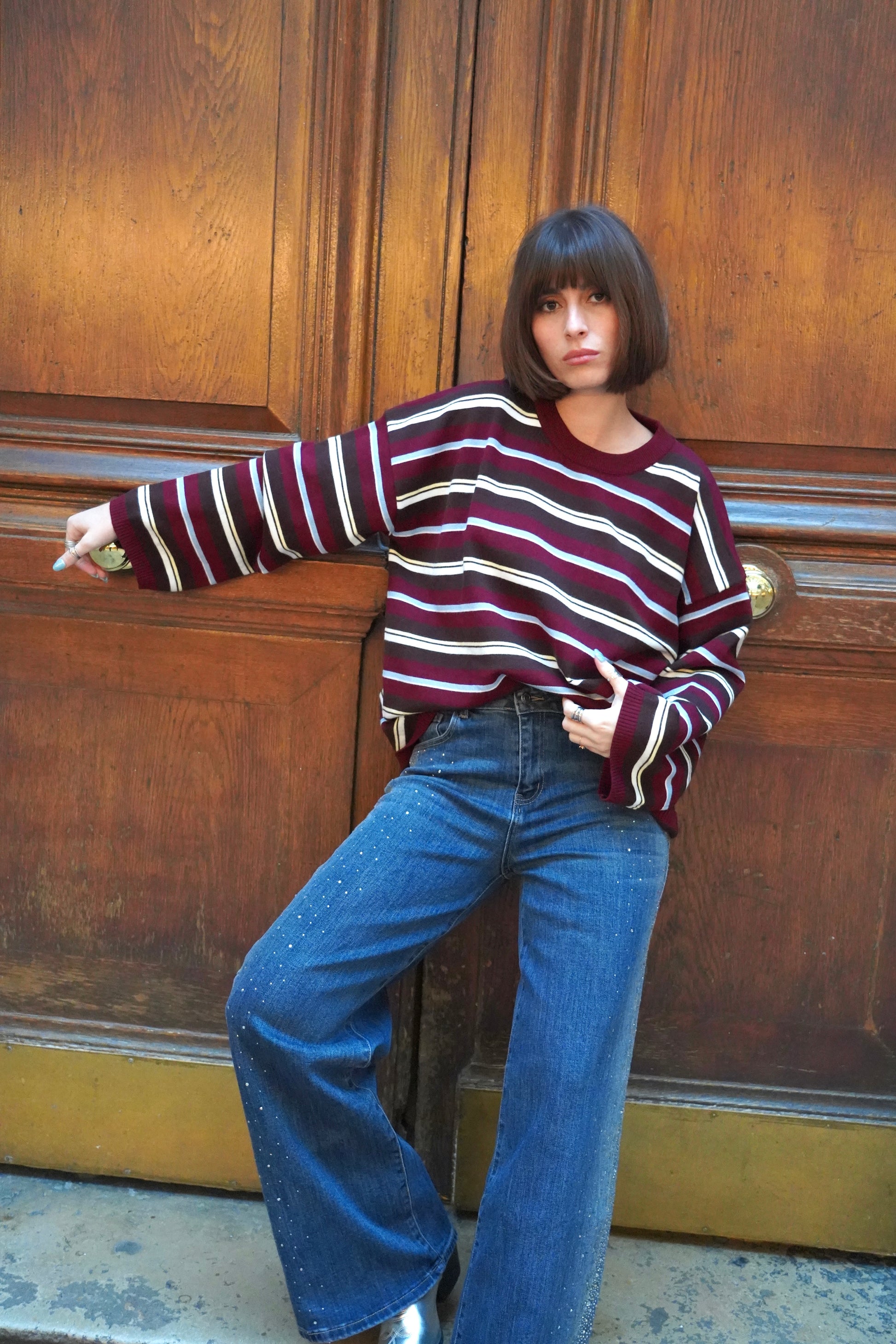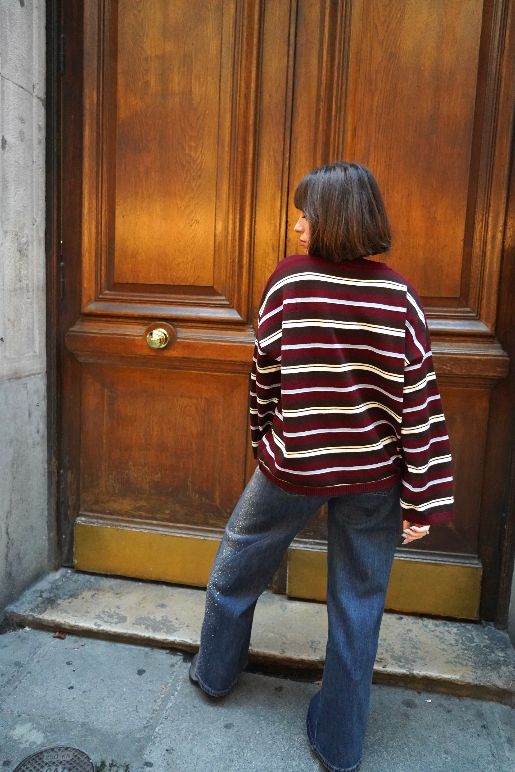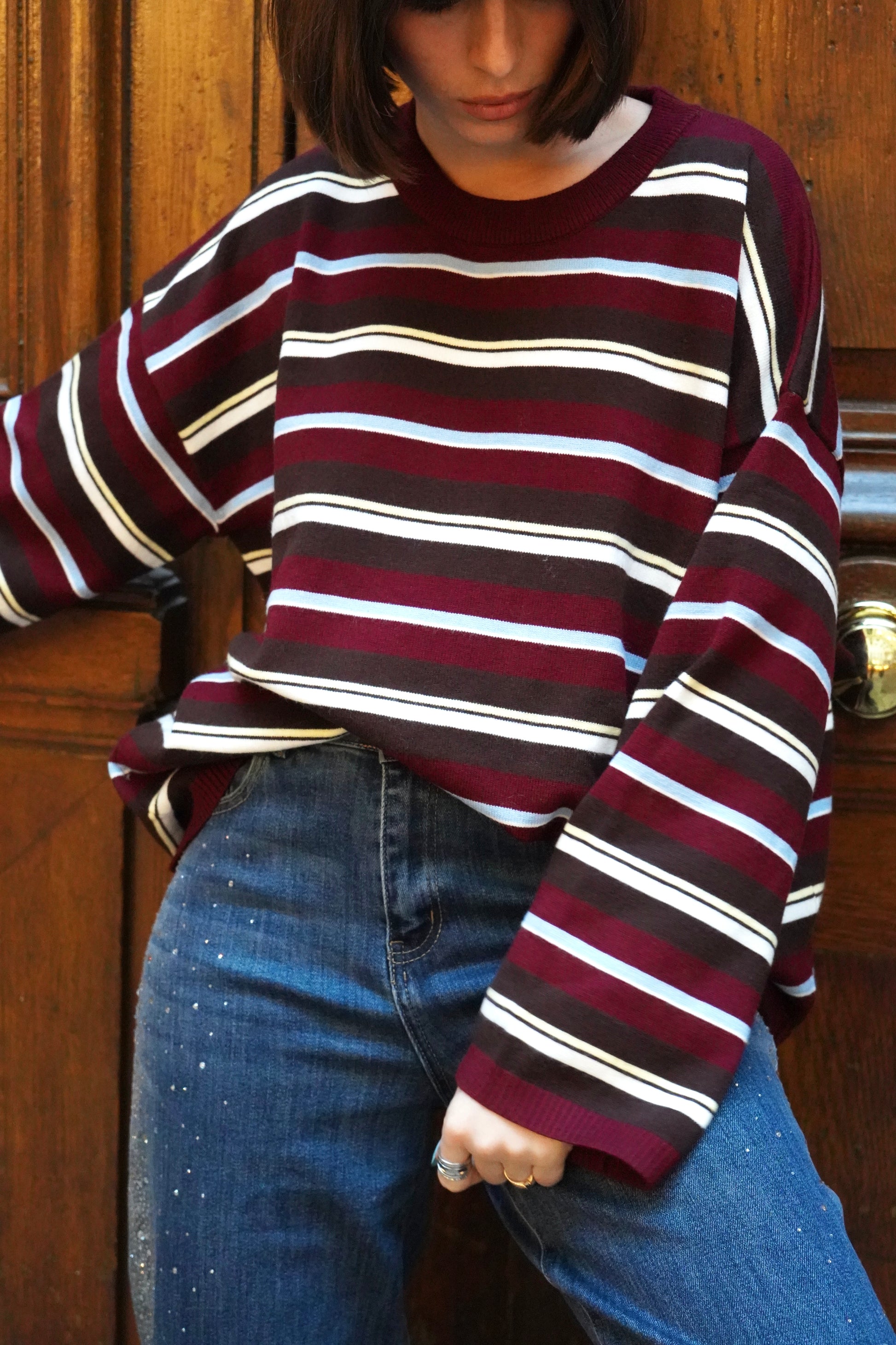 • Striped sweater in shades of burgundy, brown, sky blue and ecru