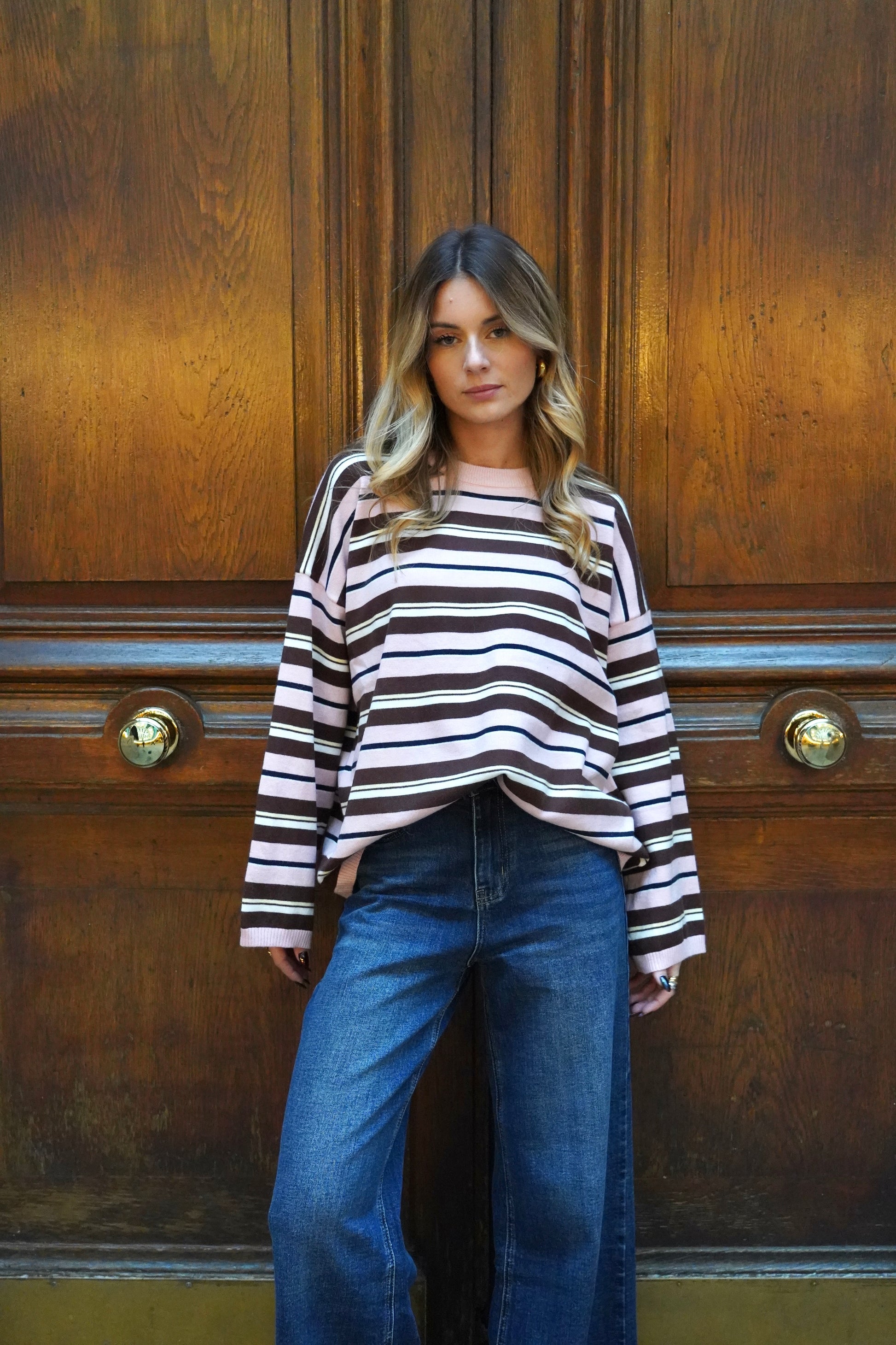 • Striped sweater in shades of pink, chocolate, ecru and white
