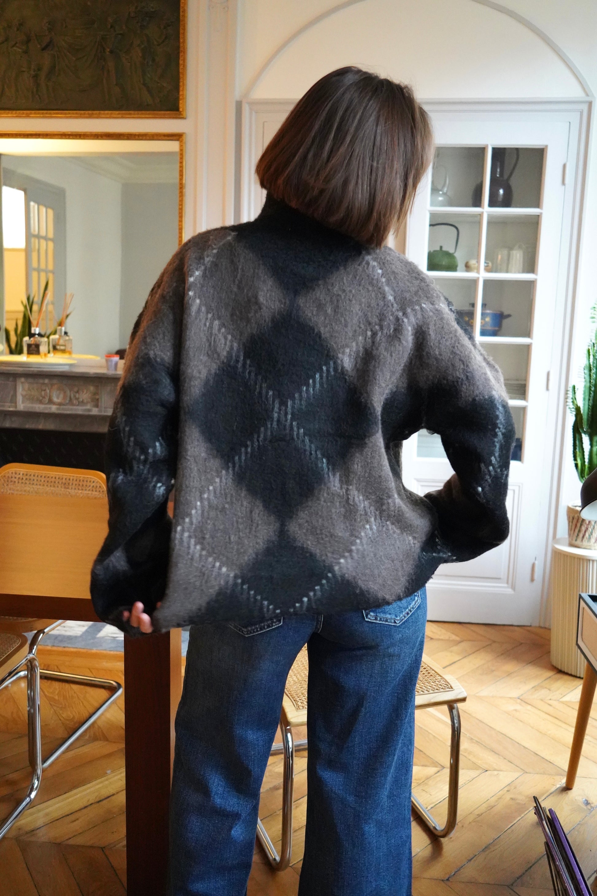 • Pull chaud à grands losanges noir, gris et taupe