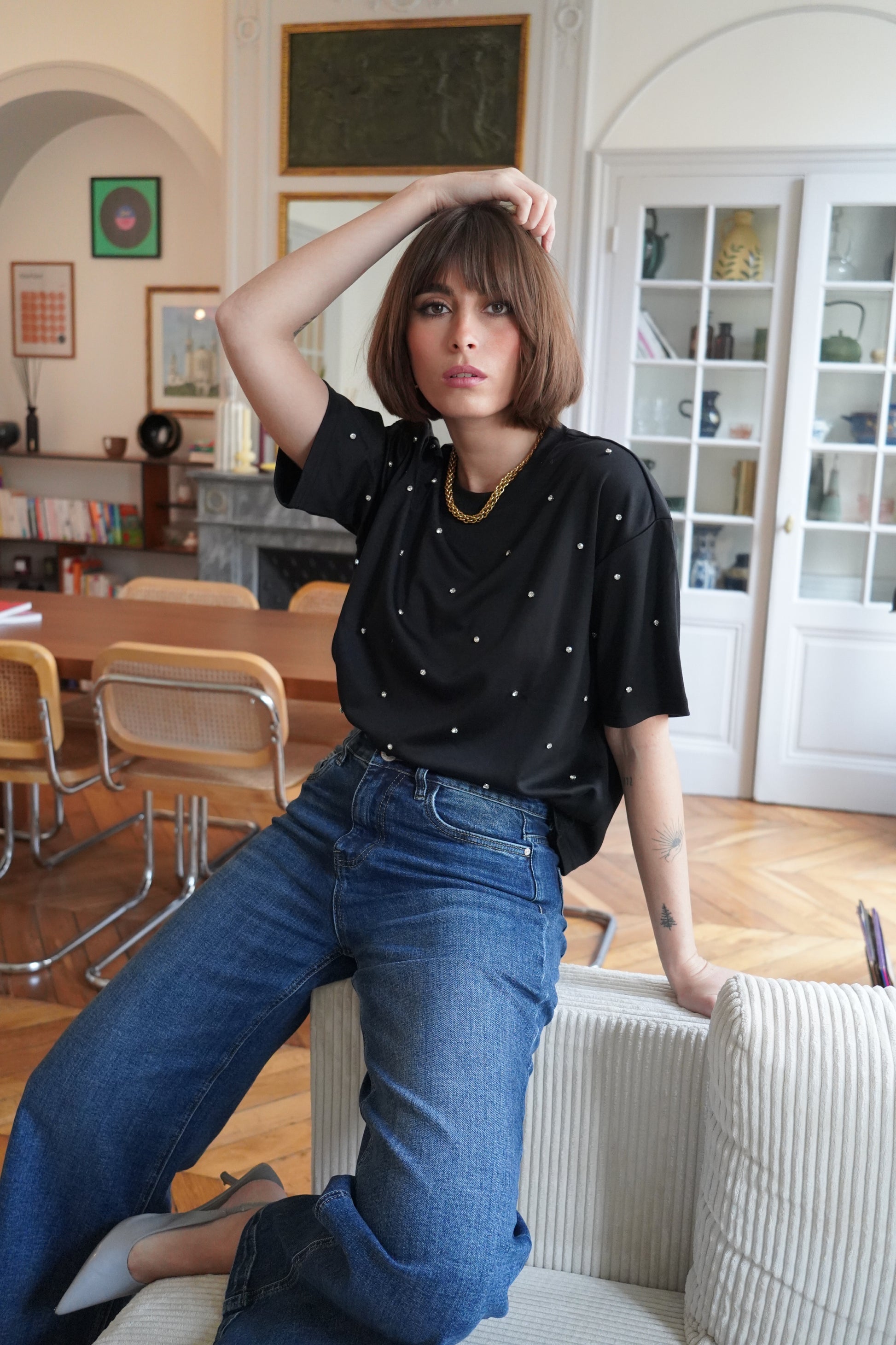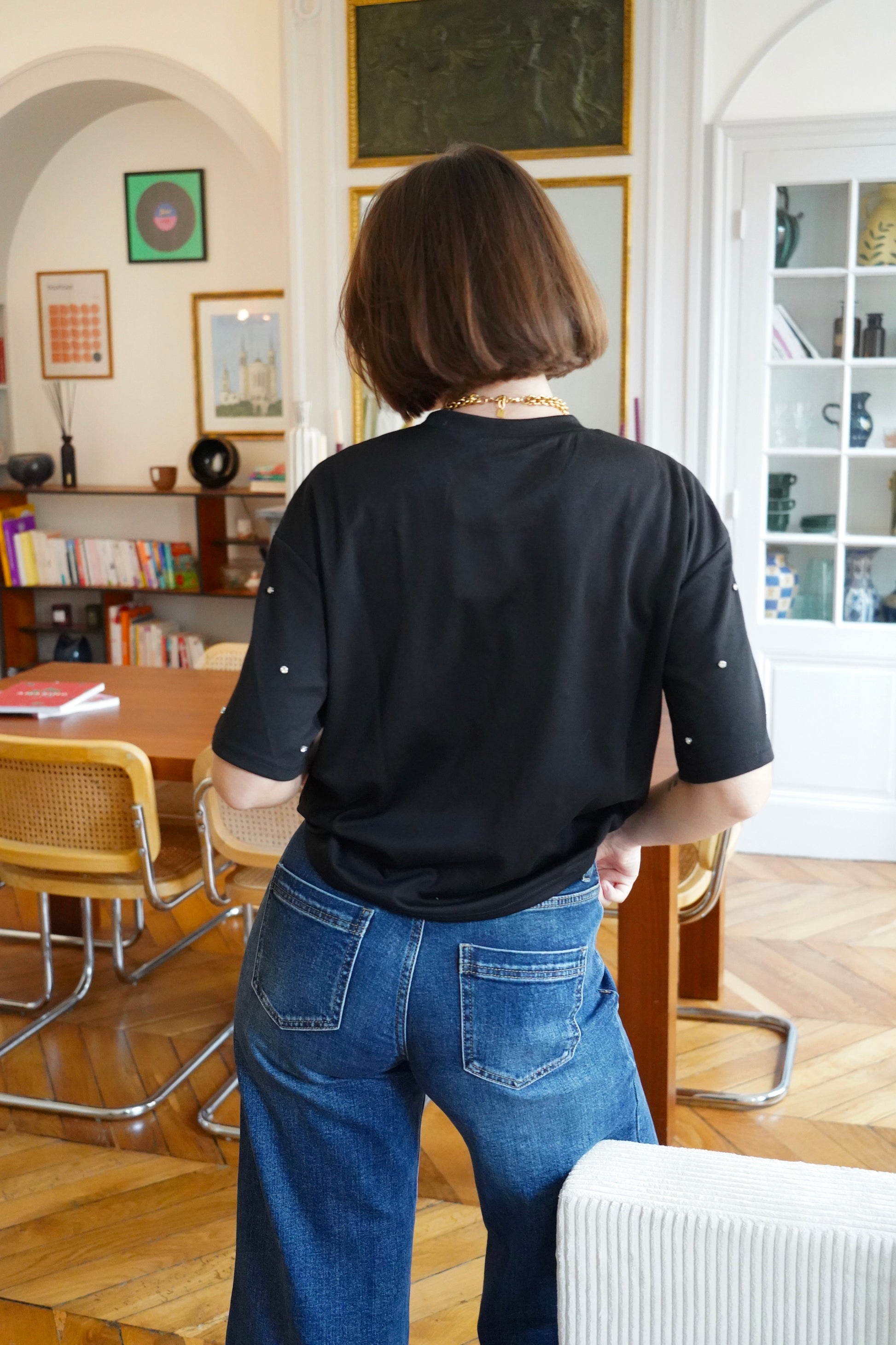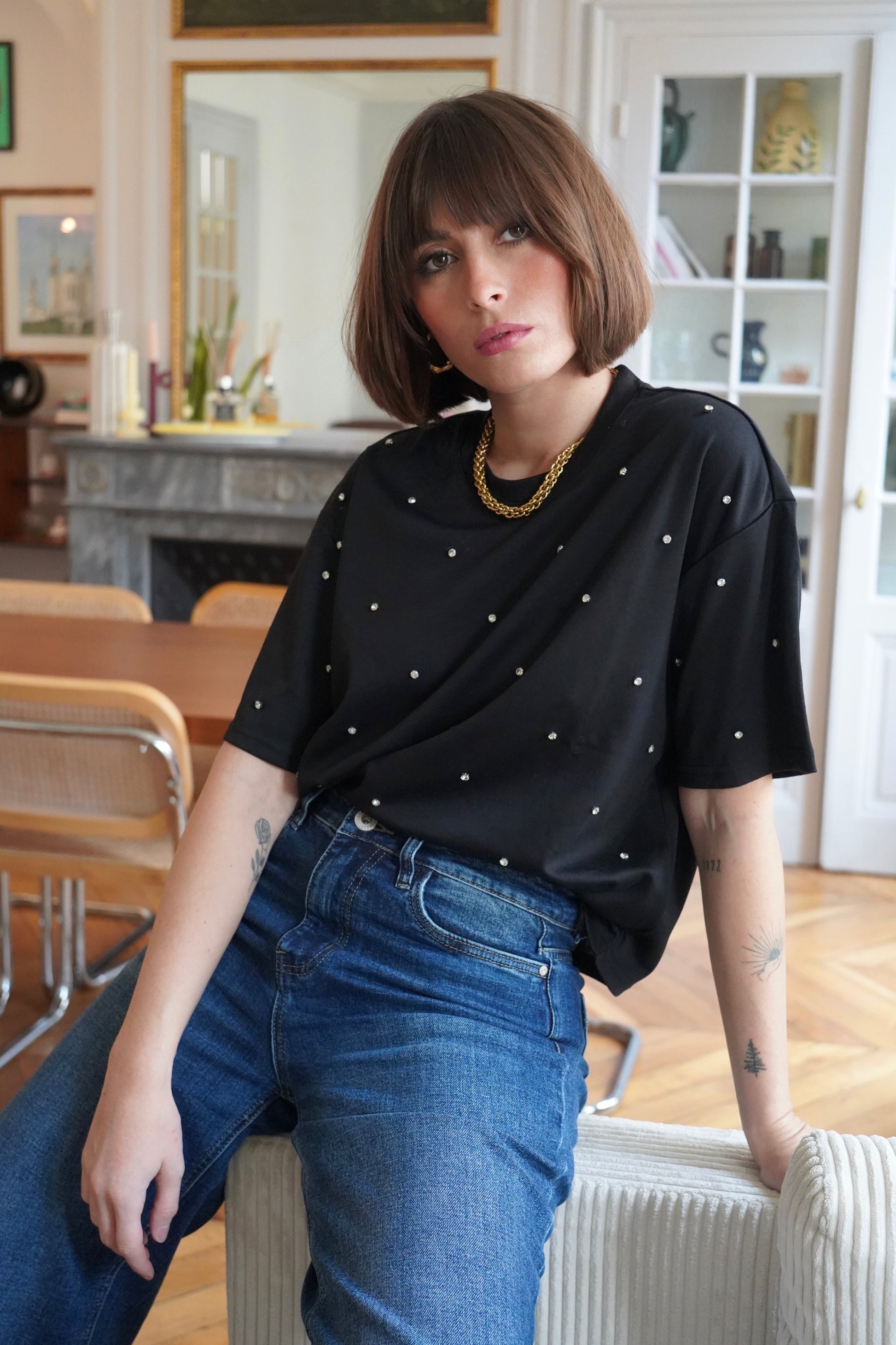 • T-shirt noir fluide orné de strass argentées sur l'avant
