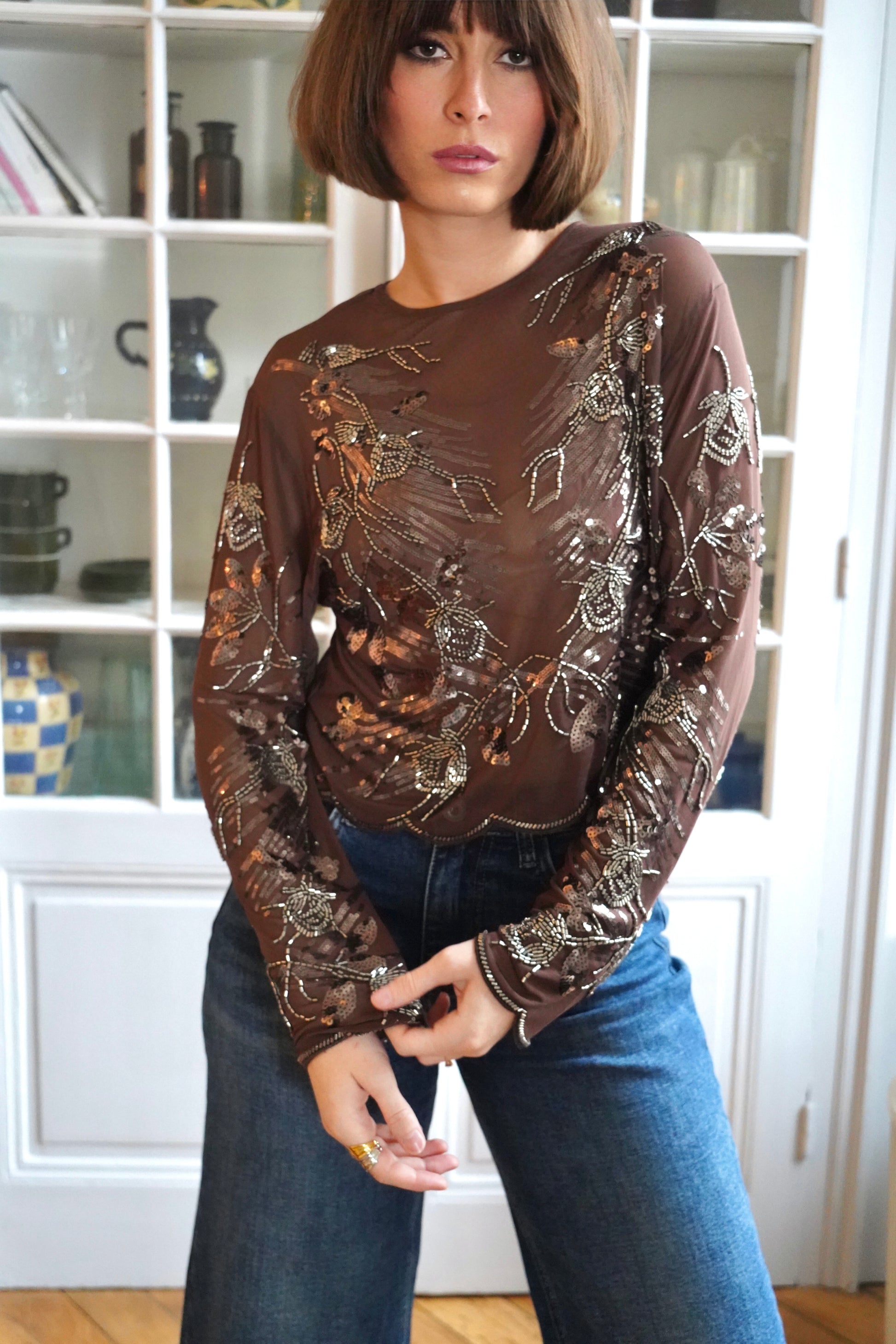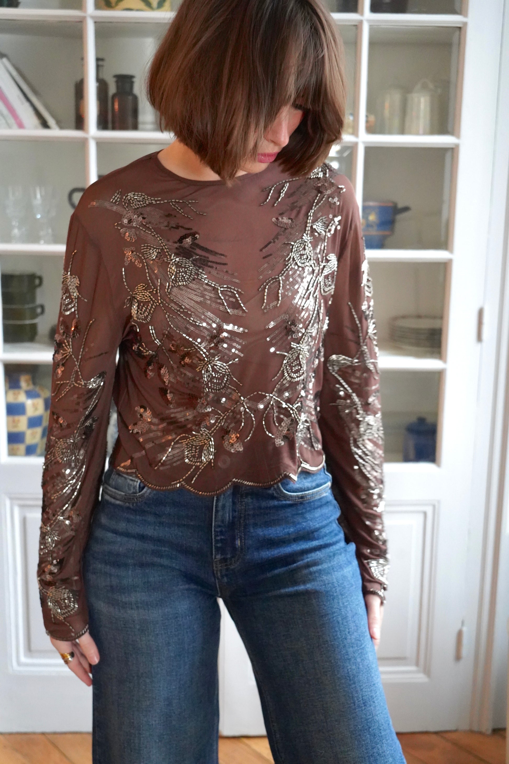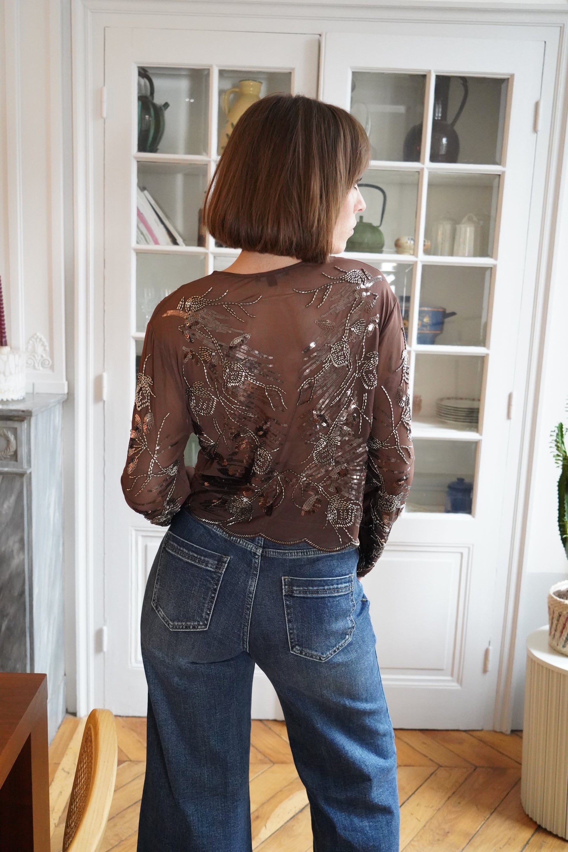 • Top transparent couleur chocolat orné de broderies métallisées