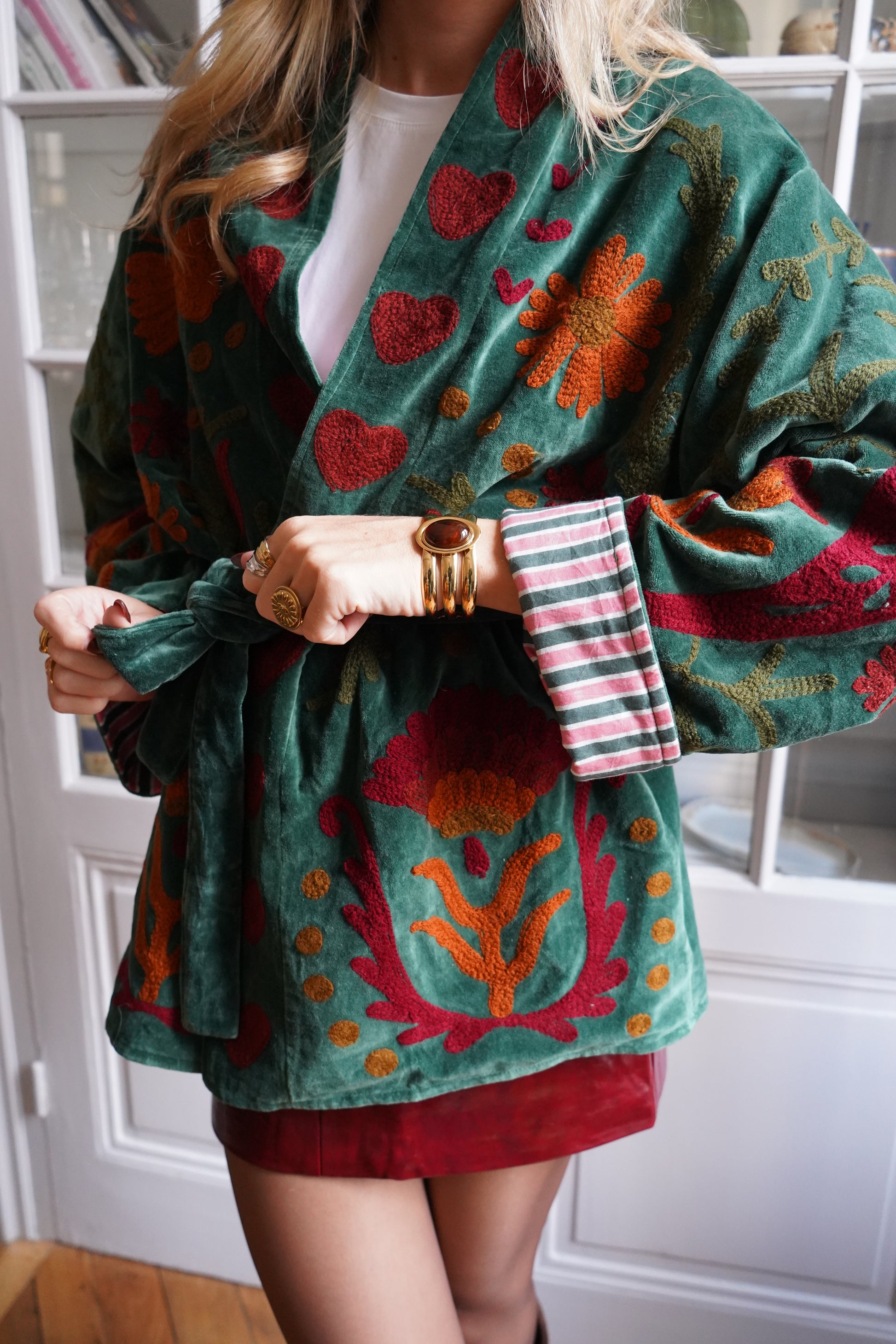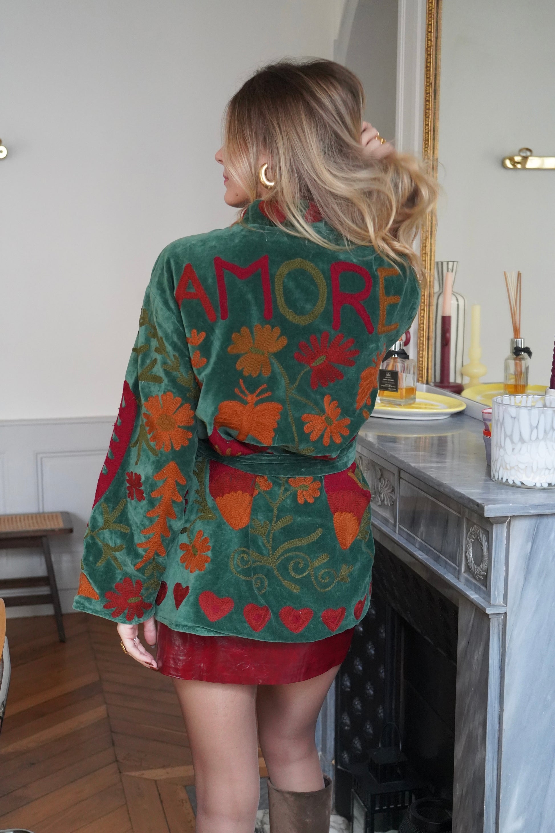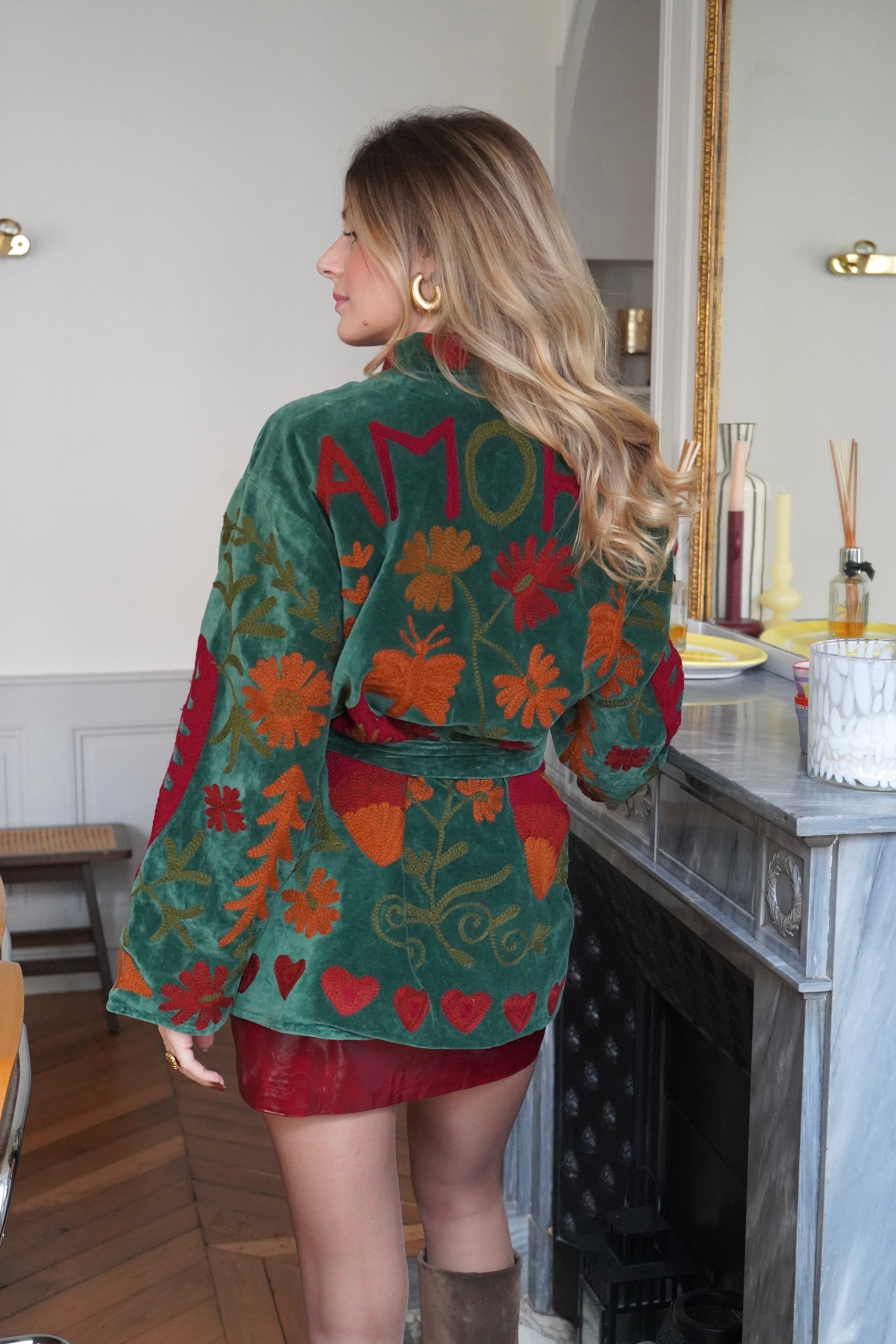 • Broderies colorées : cœurs, fleurs, lettrage AMOR Ceinture assortie à nouer à la taille