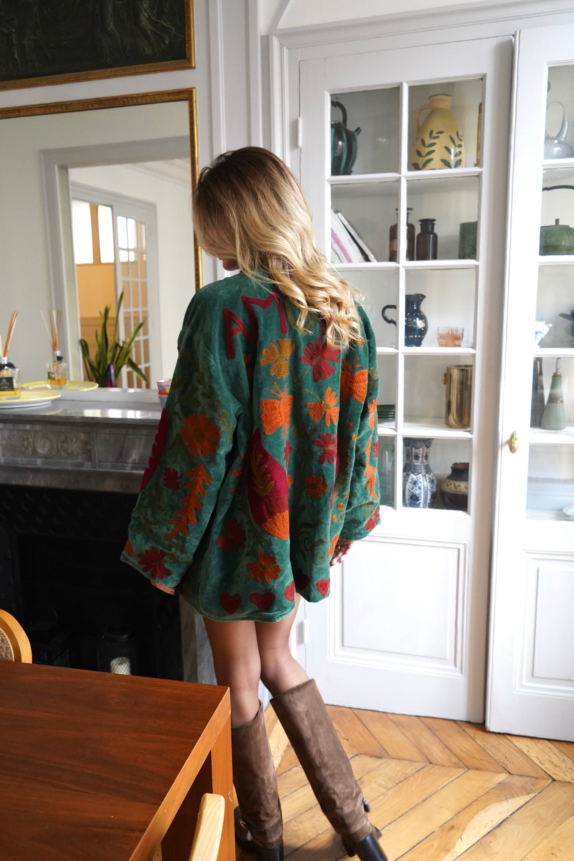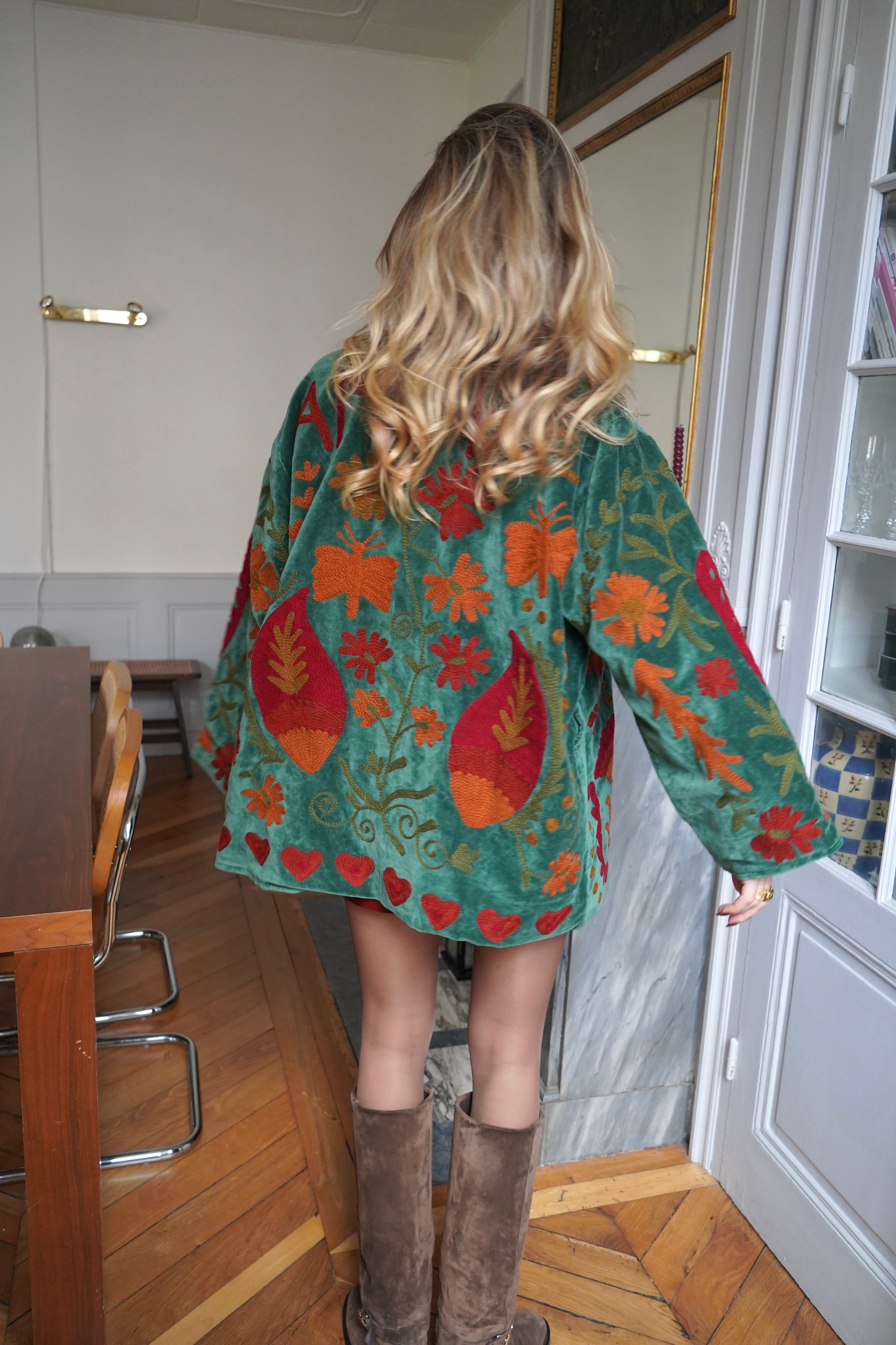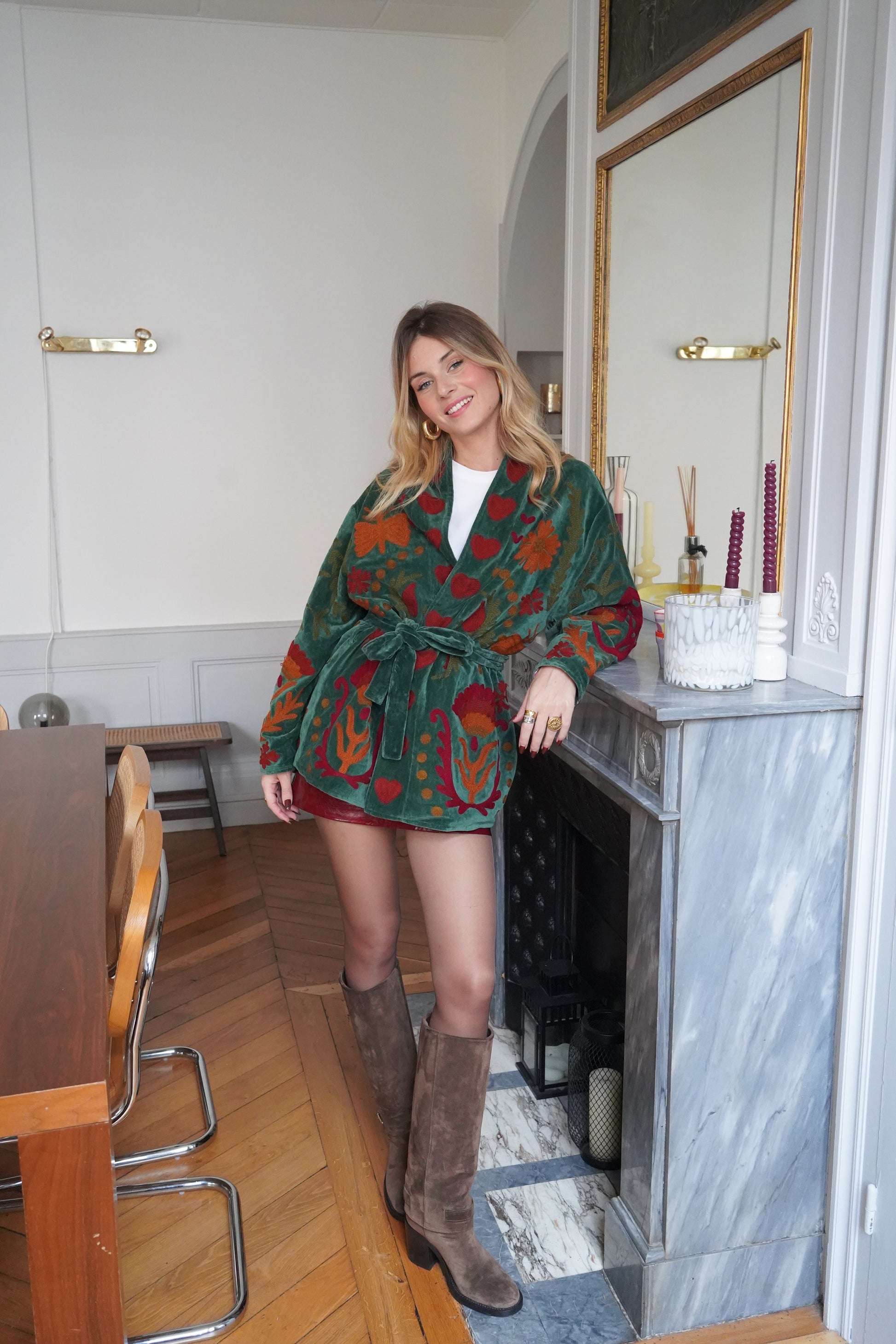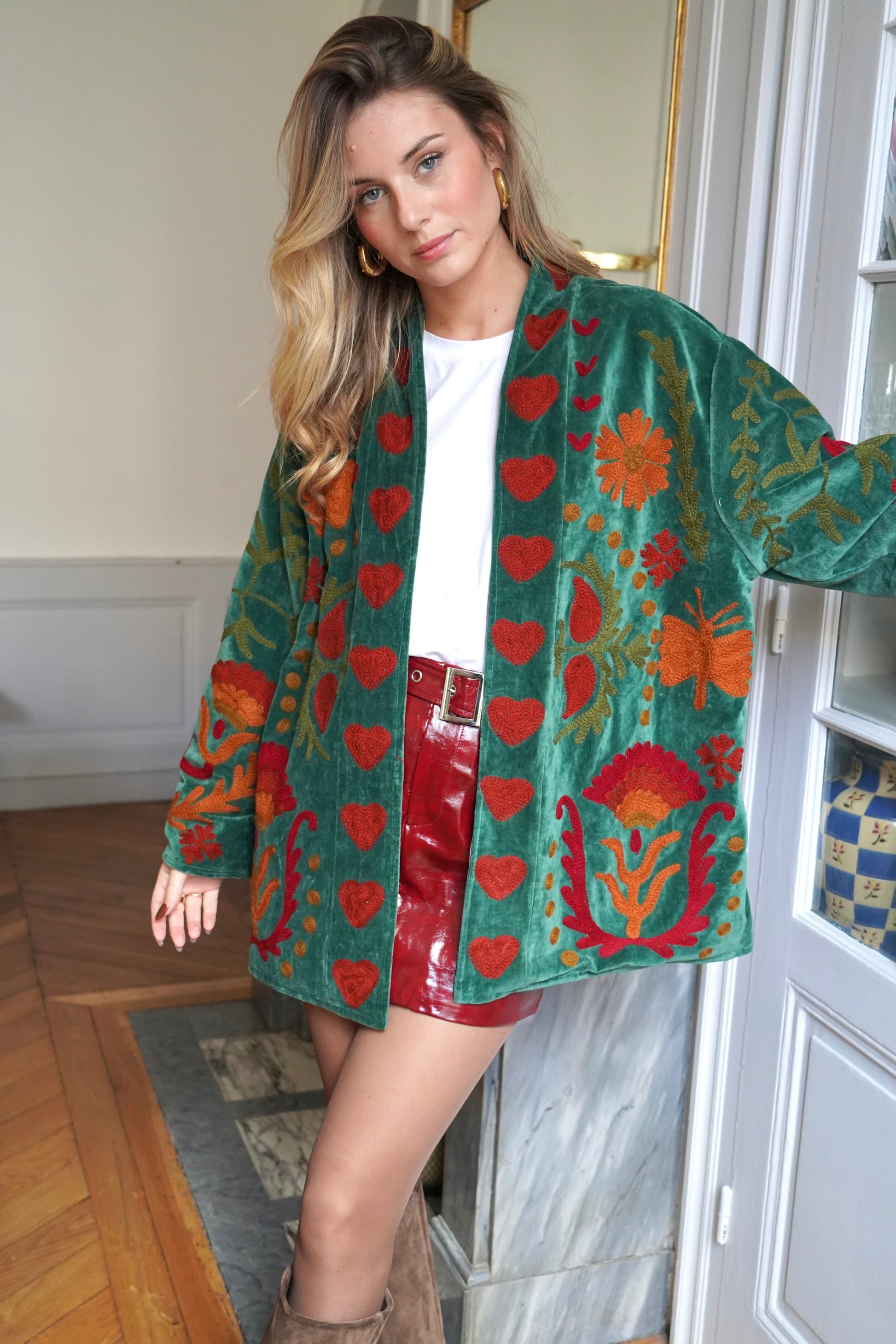 • Broderies colorées : cœurs, fleurs, lettrage AMOR Ceinture assortie à nouer à la taille