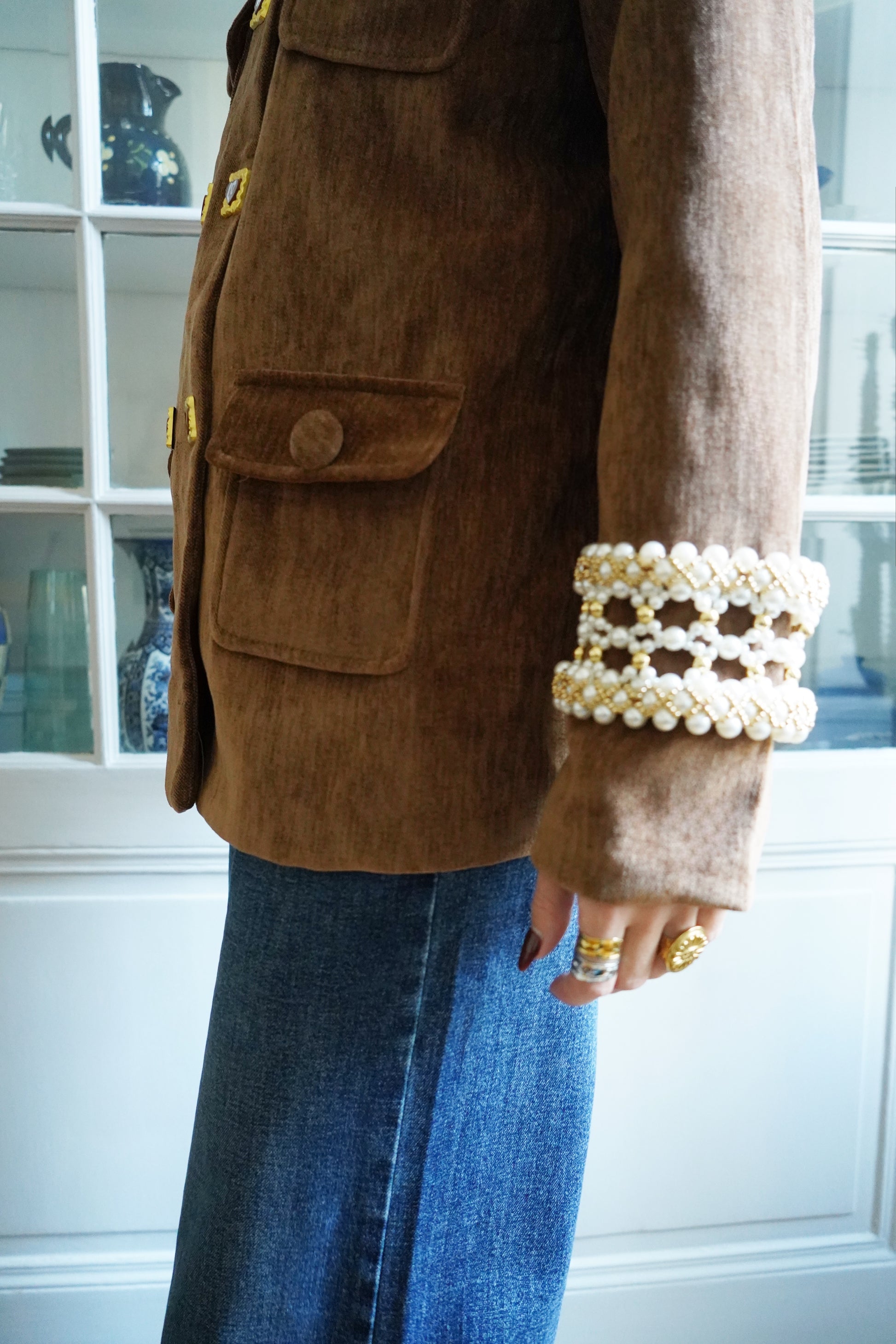 • Détails de perles tressées sur les poignets