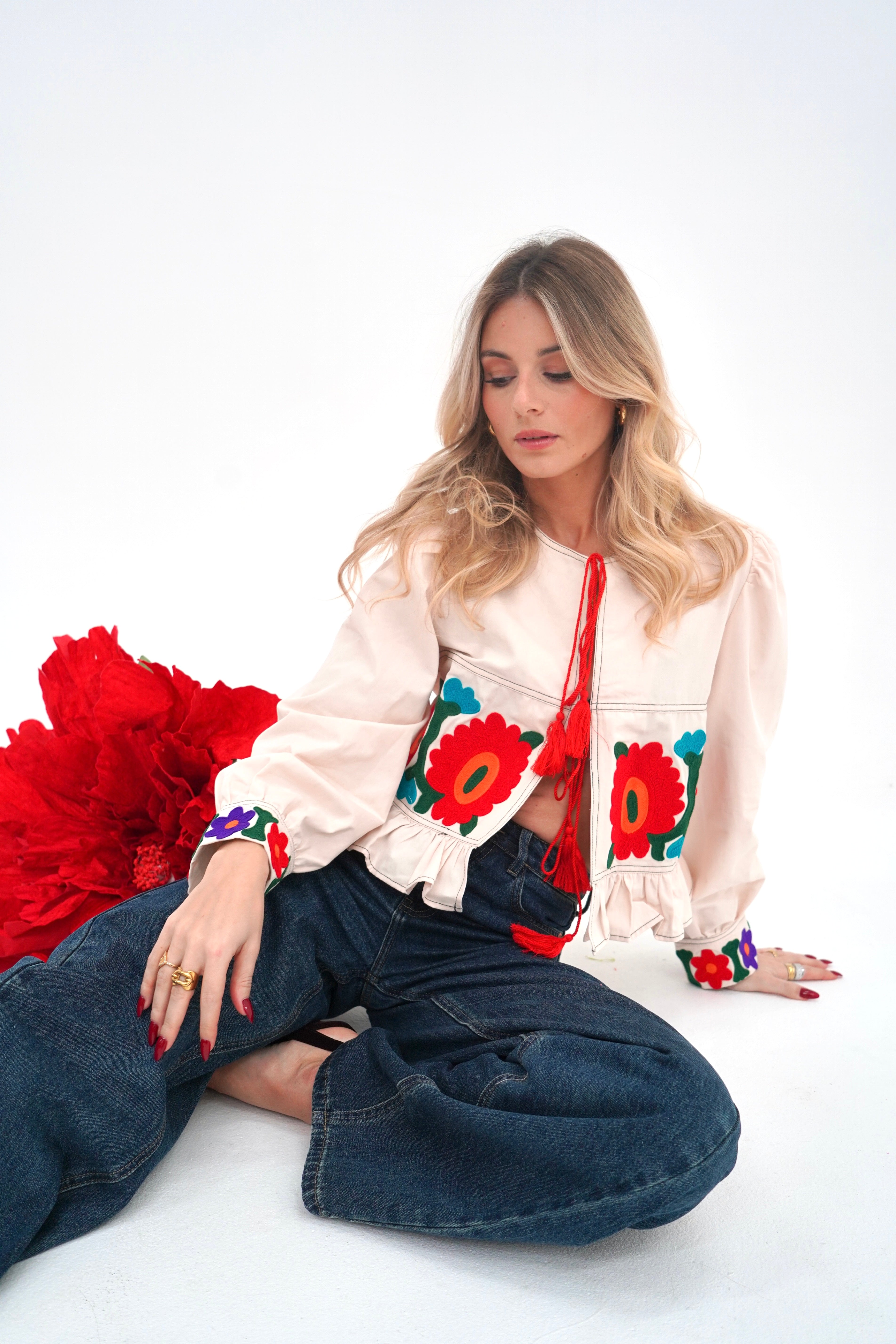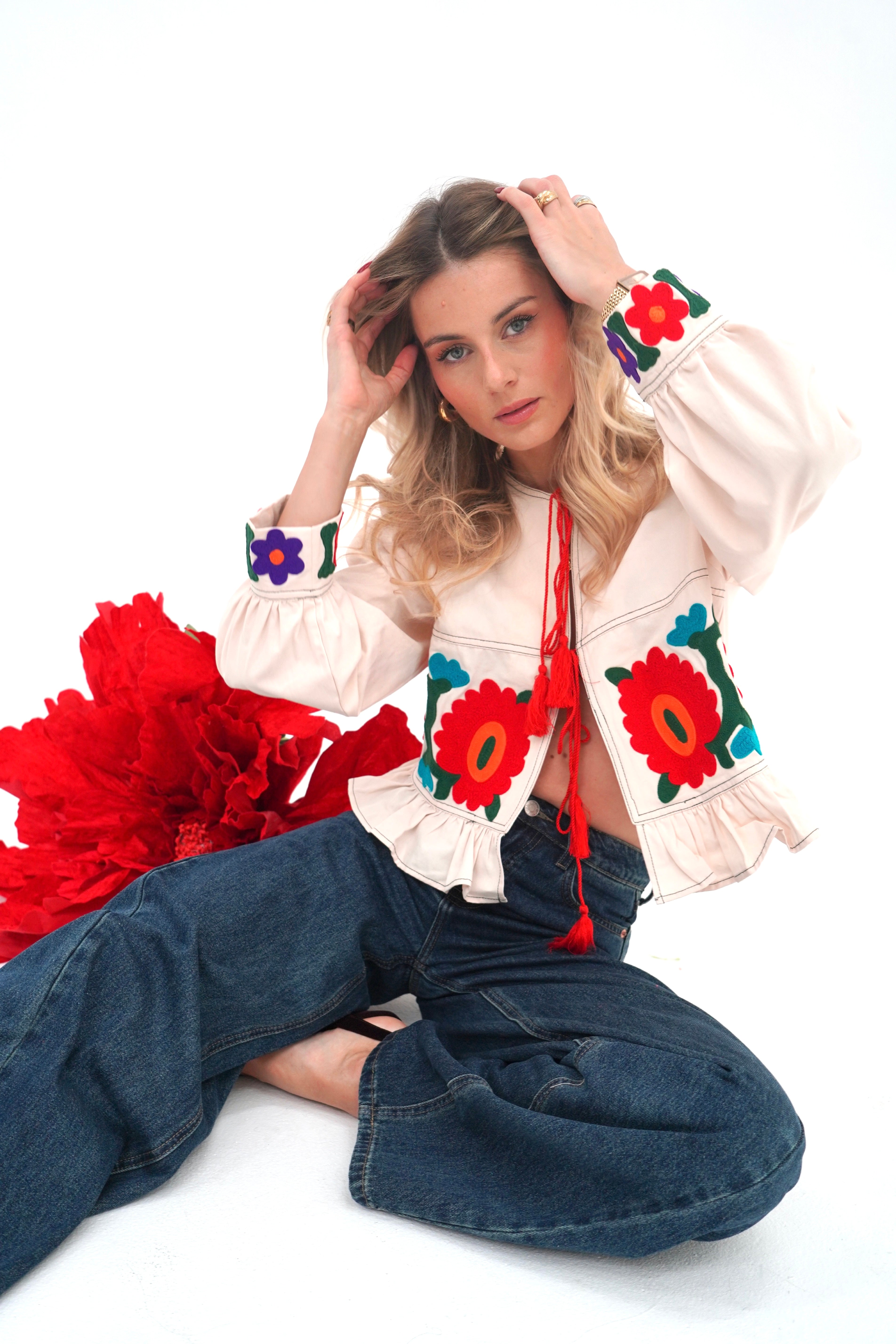 Broderies florales colorées en relief sur le devant et aux poignets.