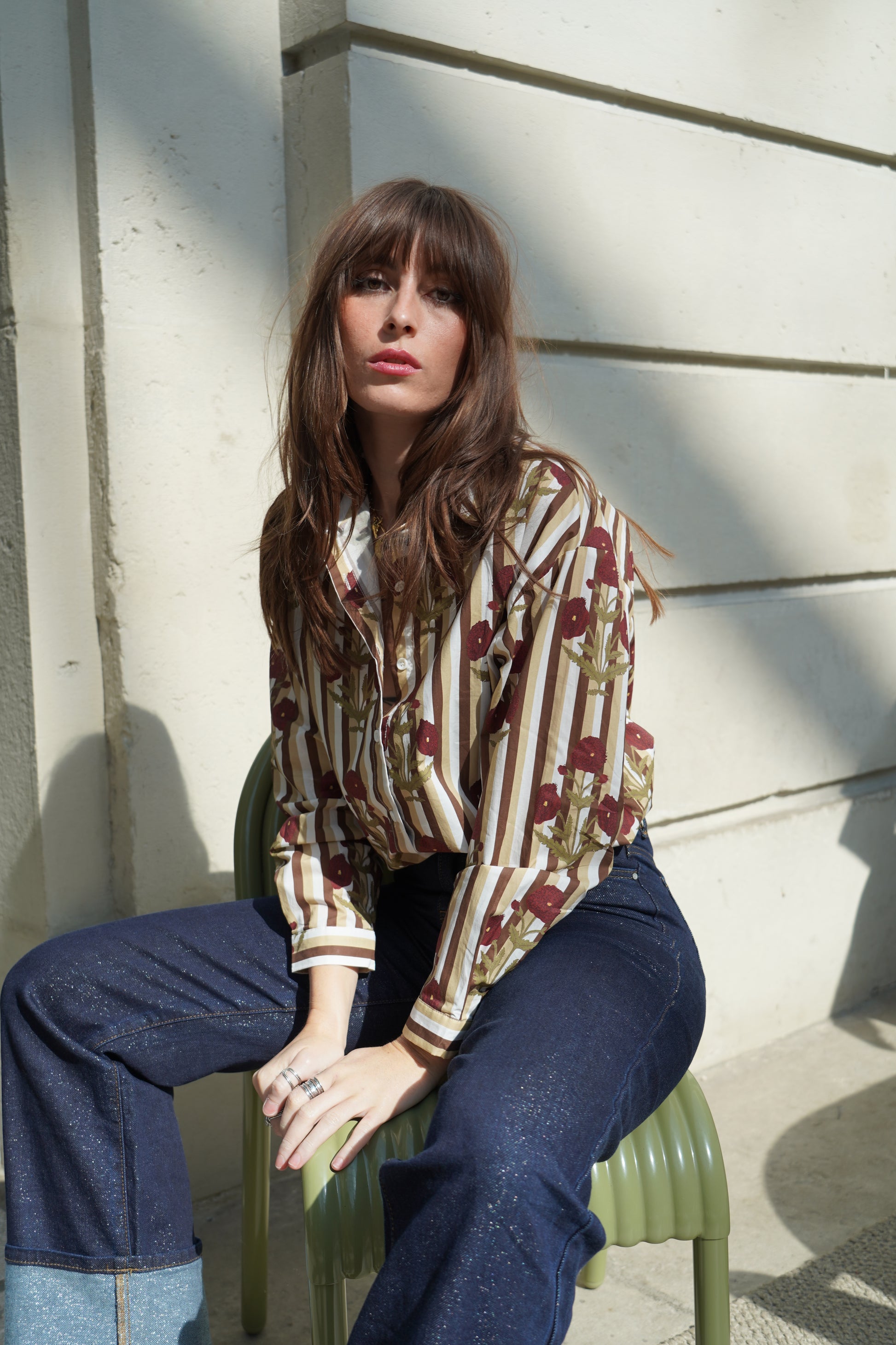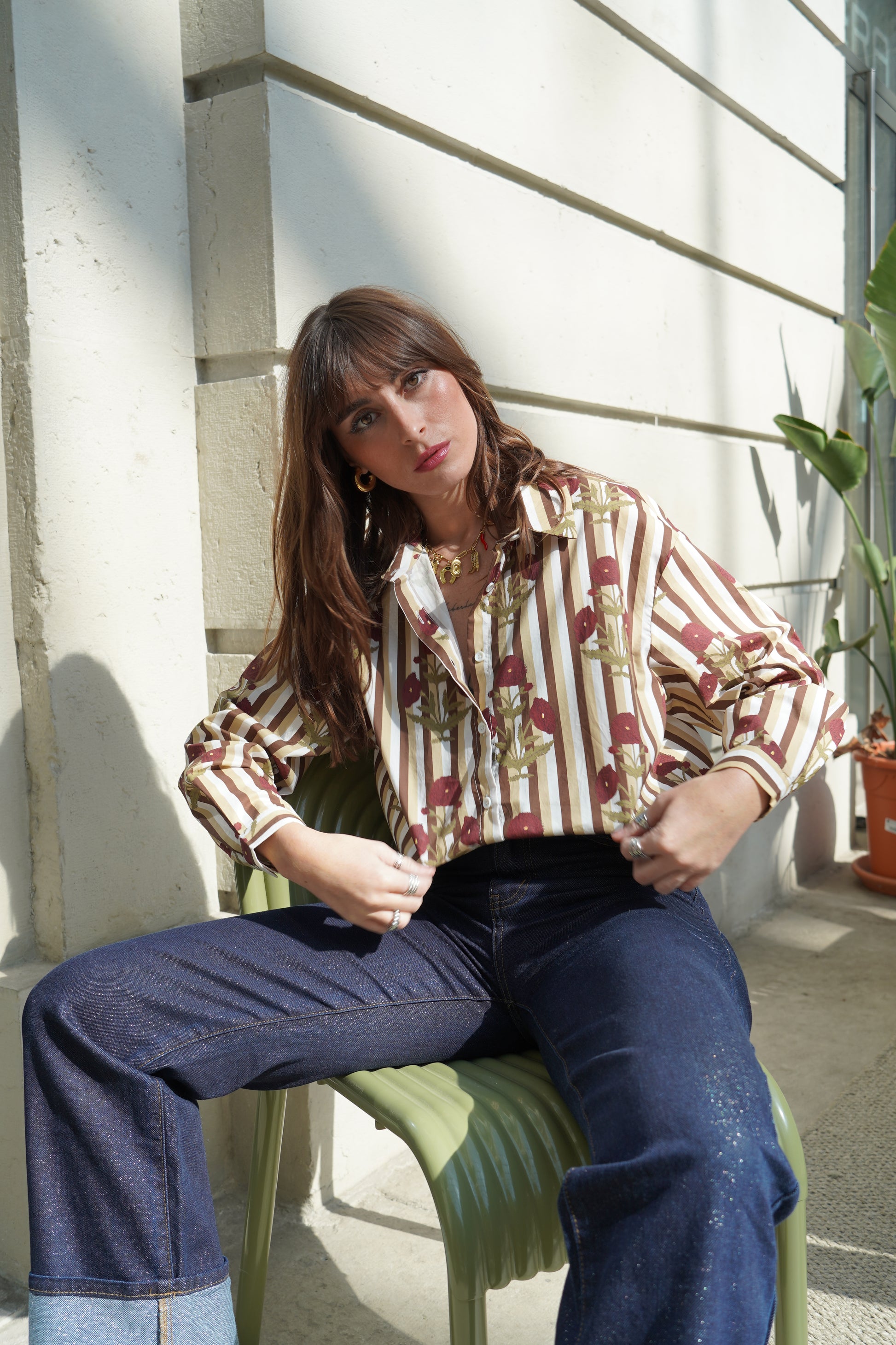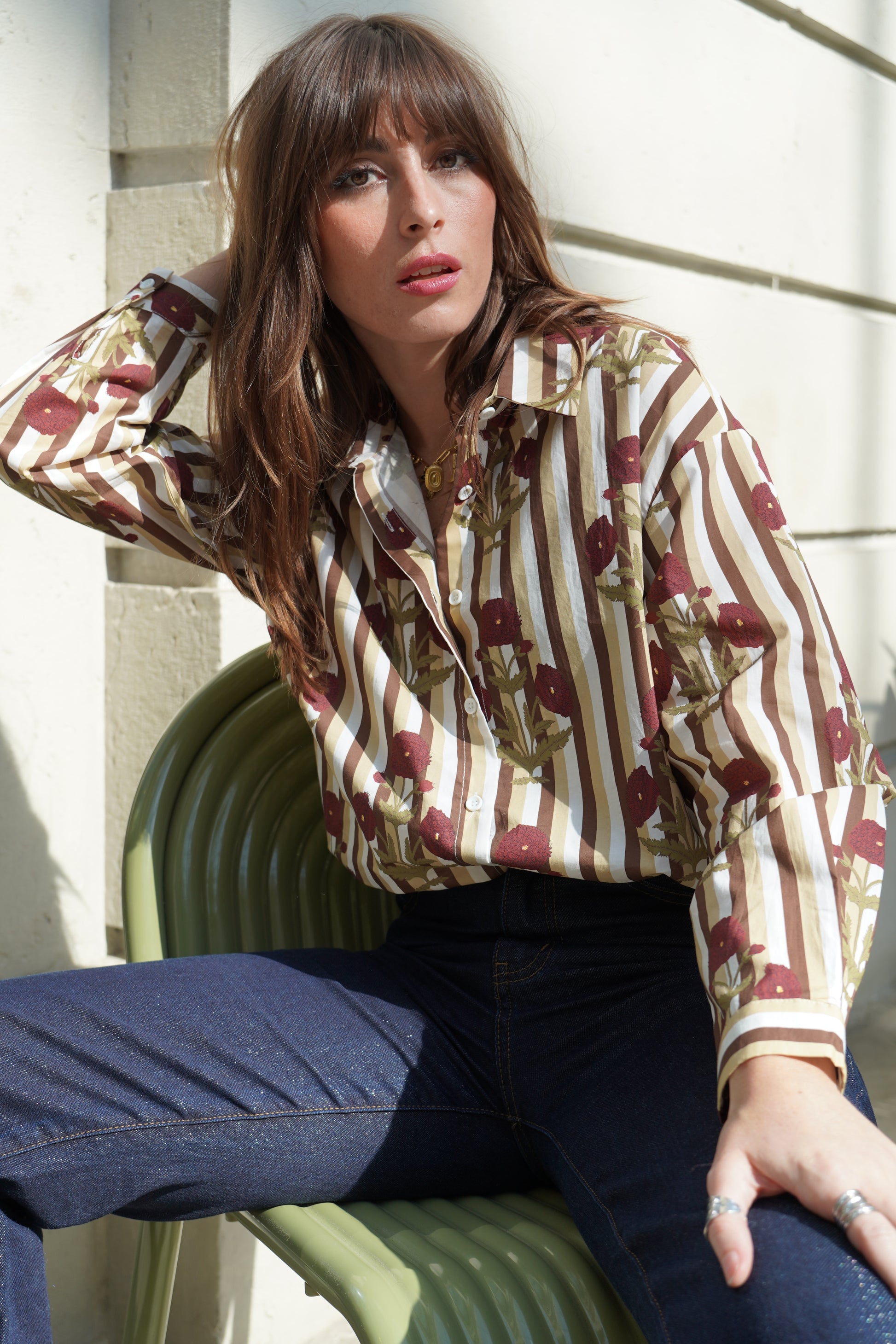 • Chemise à rayures verticales dans des tons chauds : marron, beige et blanc 🤎🤍