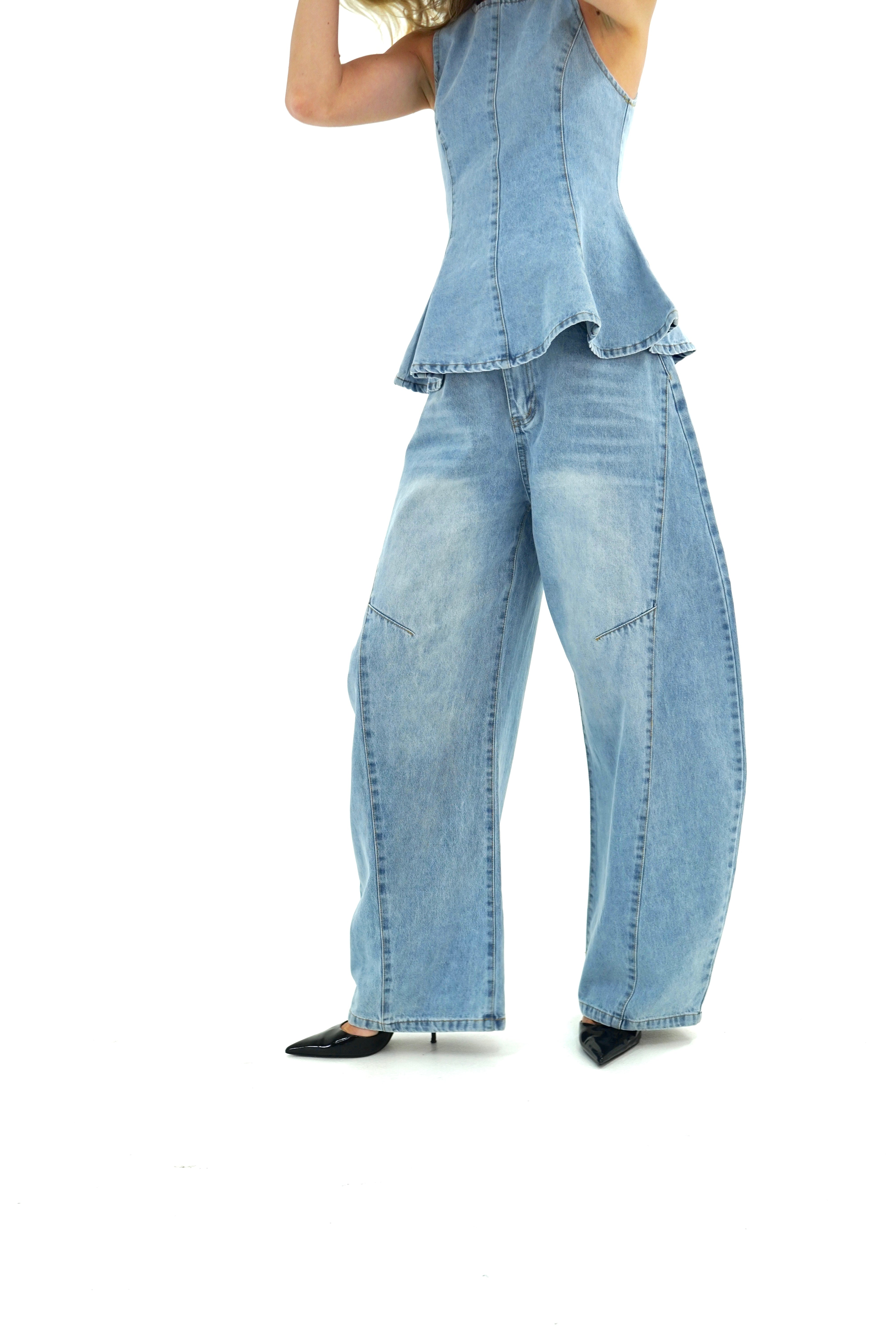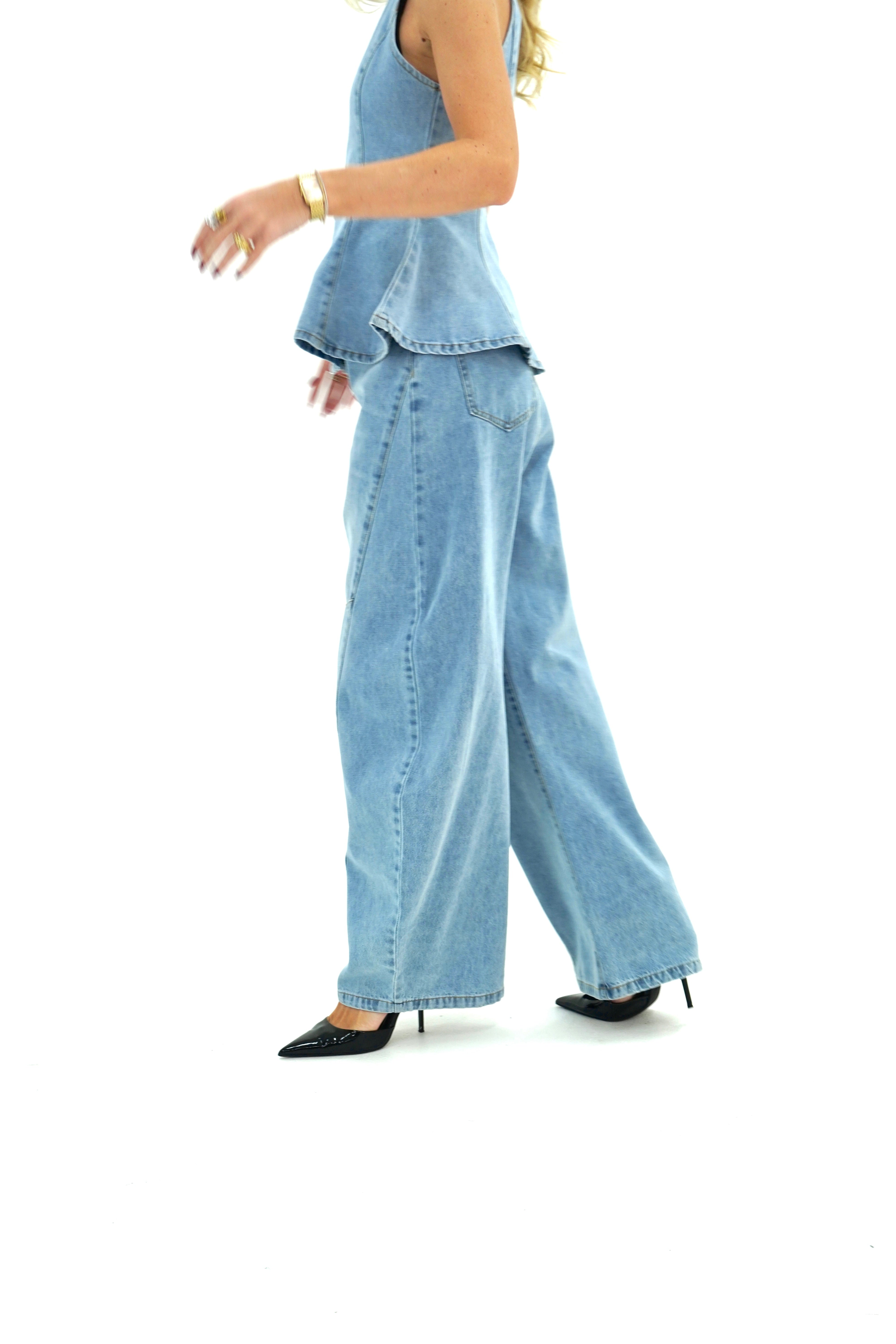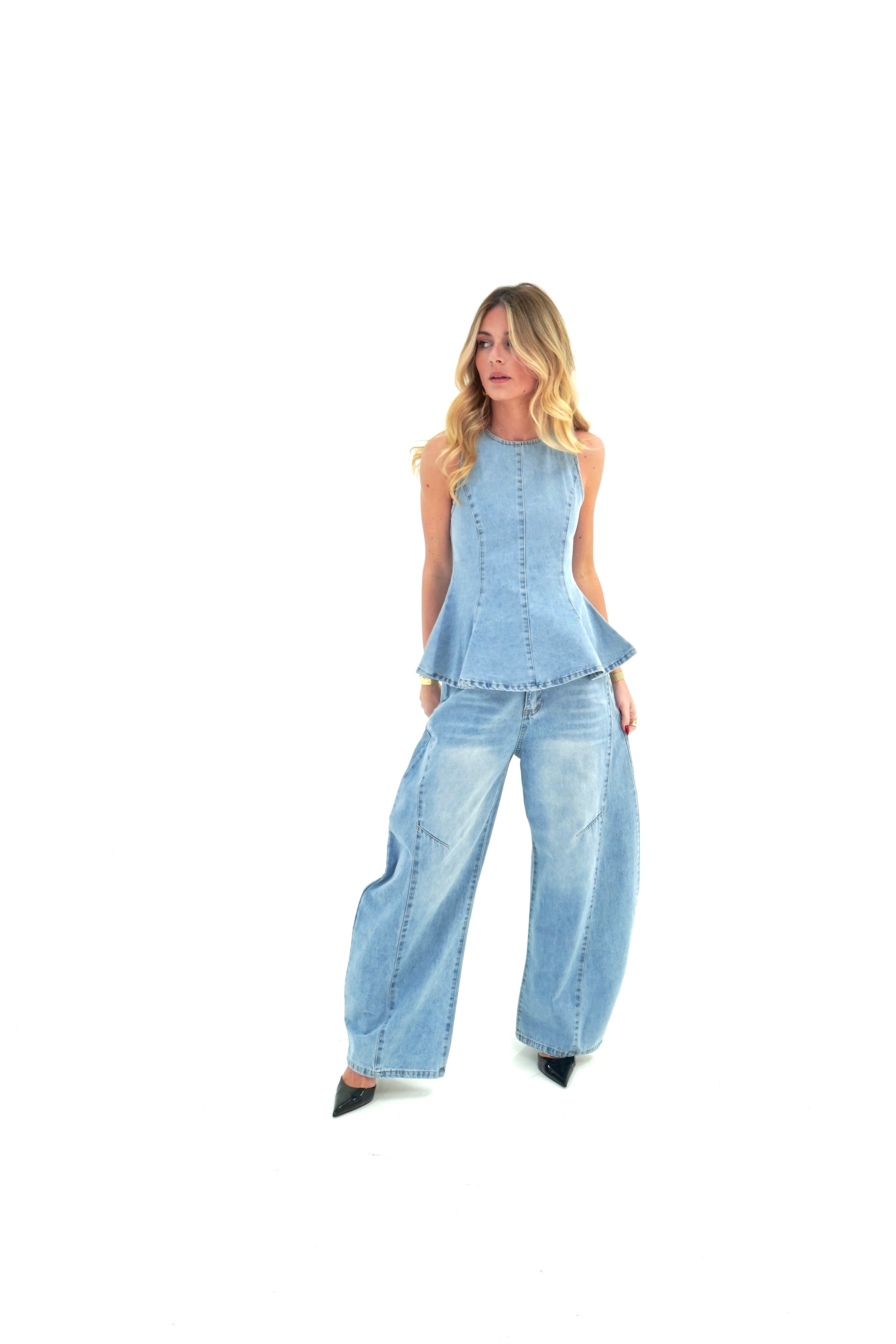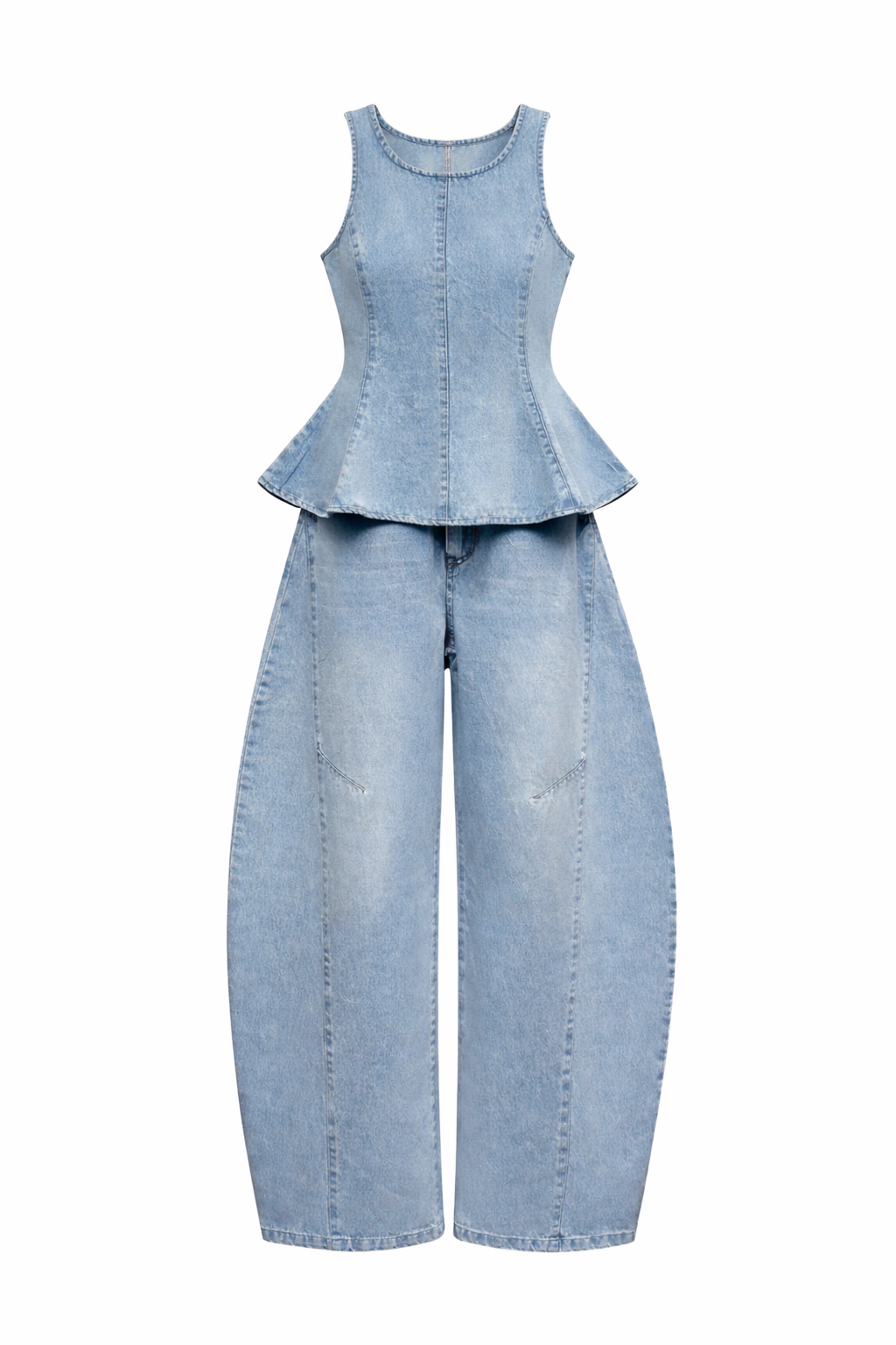 Ensemble en denim bleu clair composé d’un top sans manches et d’un pantalon assorti