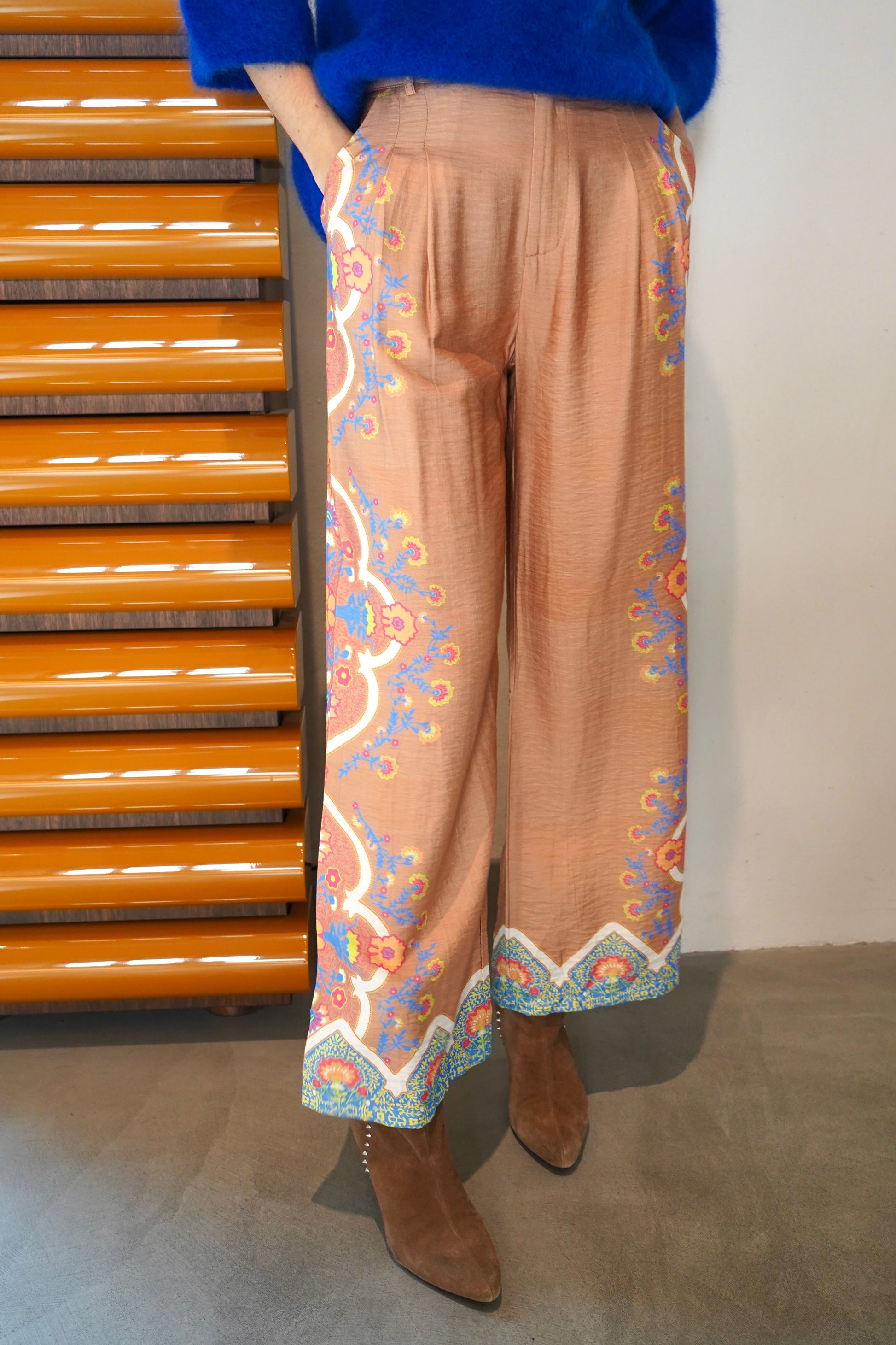 • Pantalon fluide beige taille haute à imprimé bohème et coloré