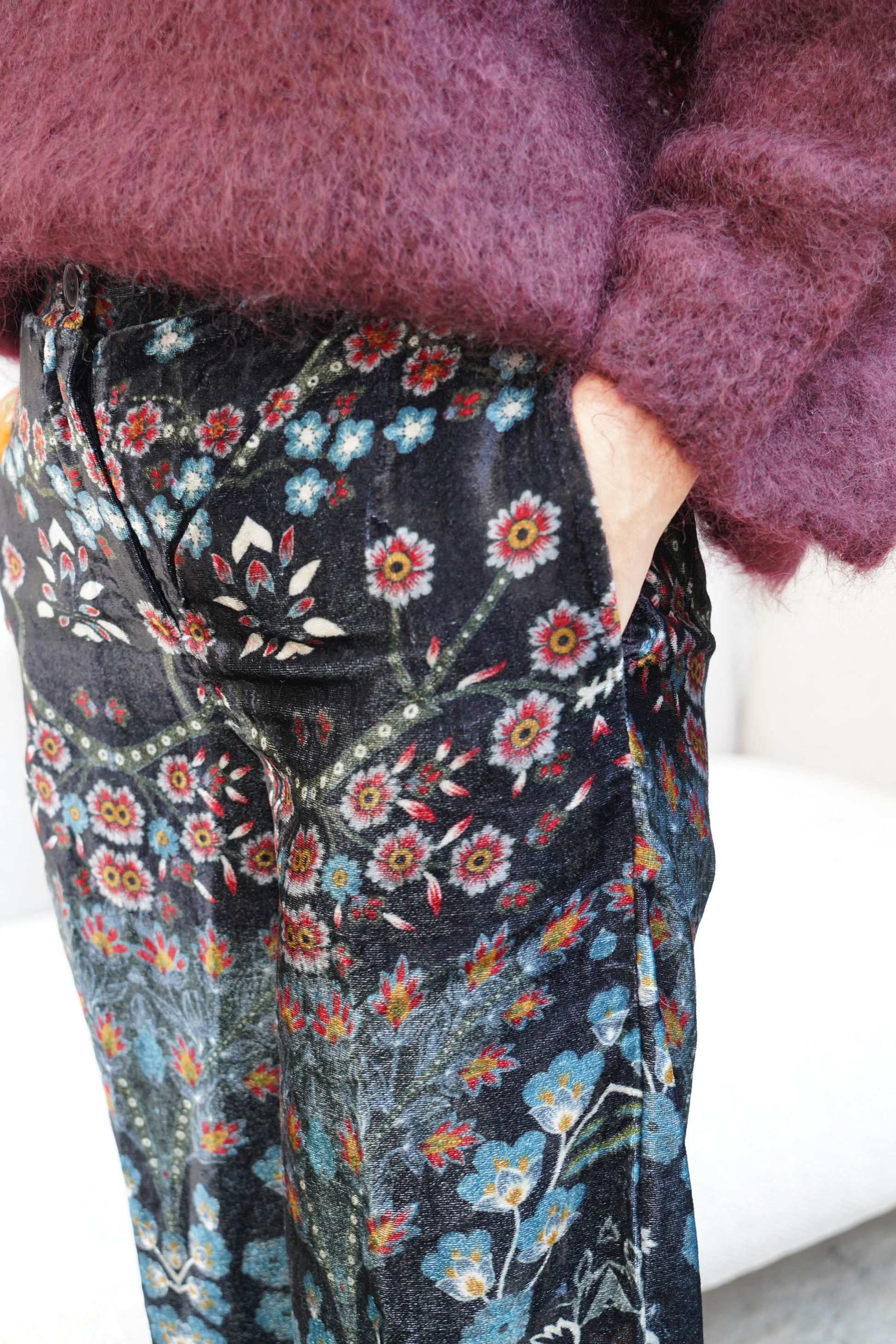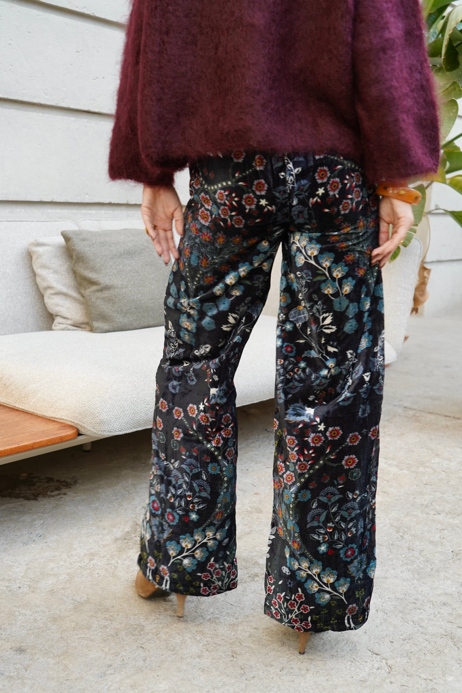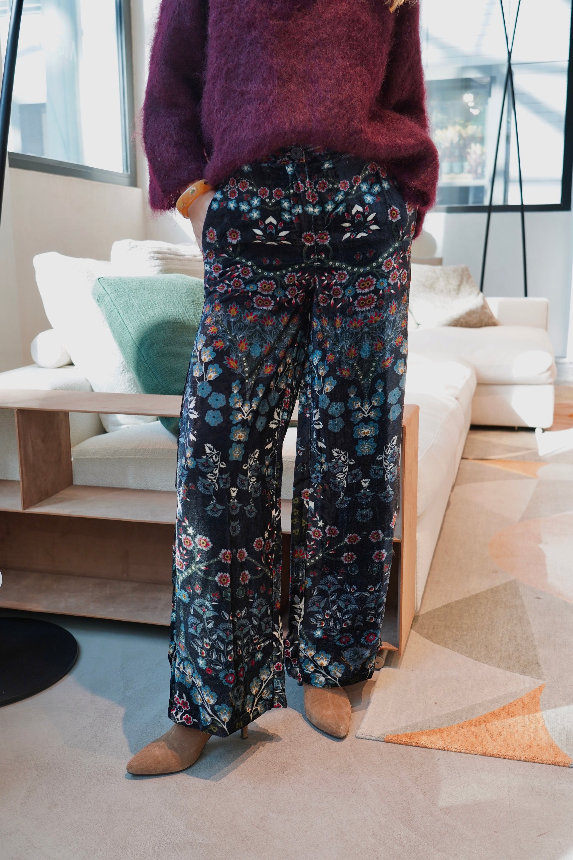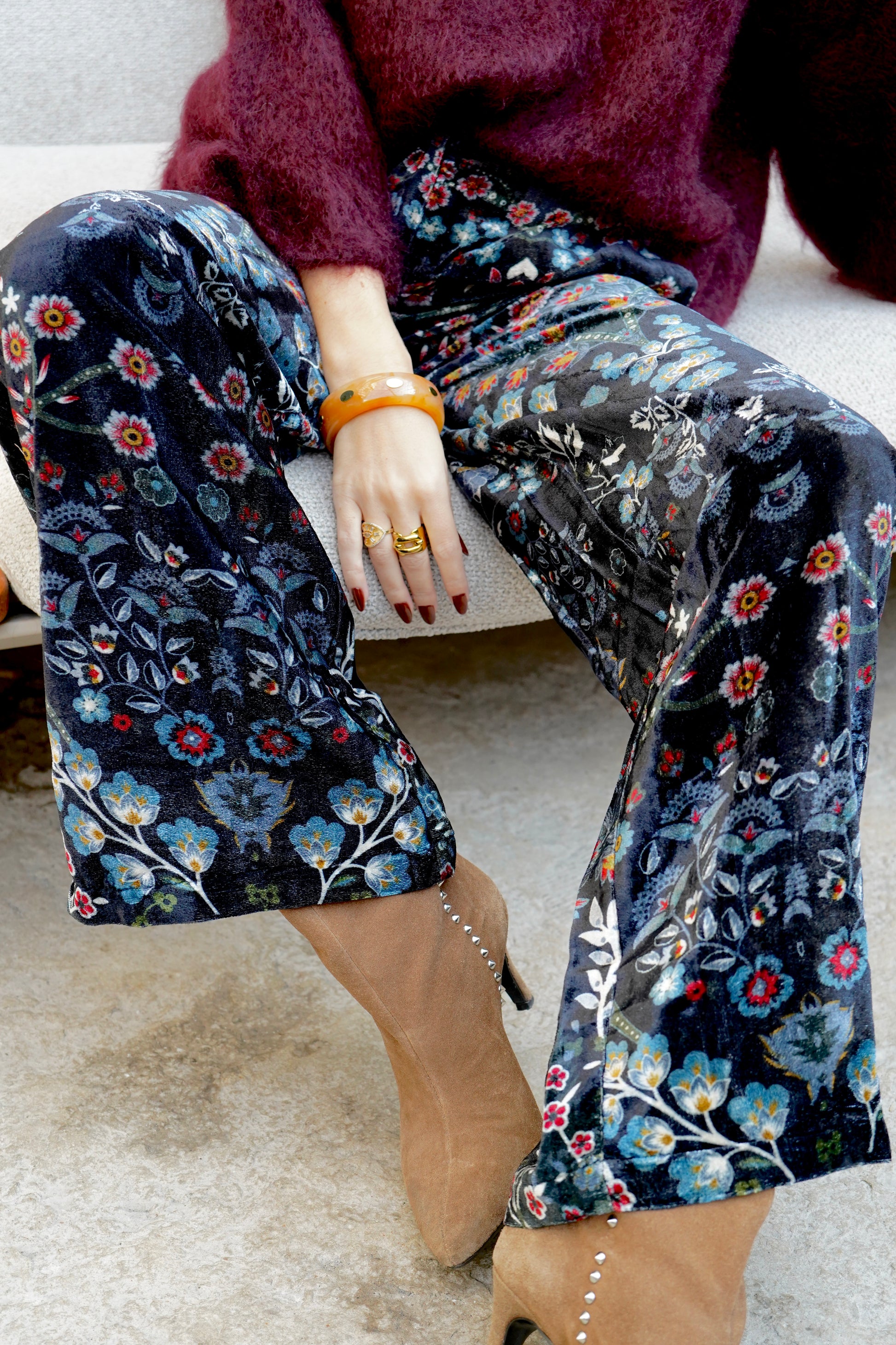 • Motifs floraux brodés dans des tons chauds bordeaux, orangés et dorés