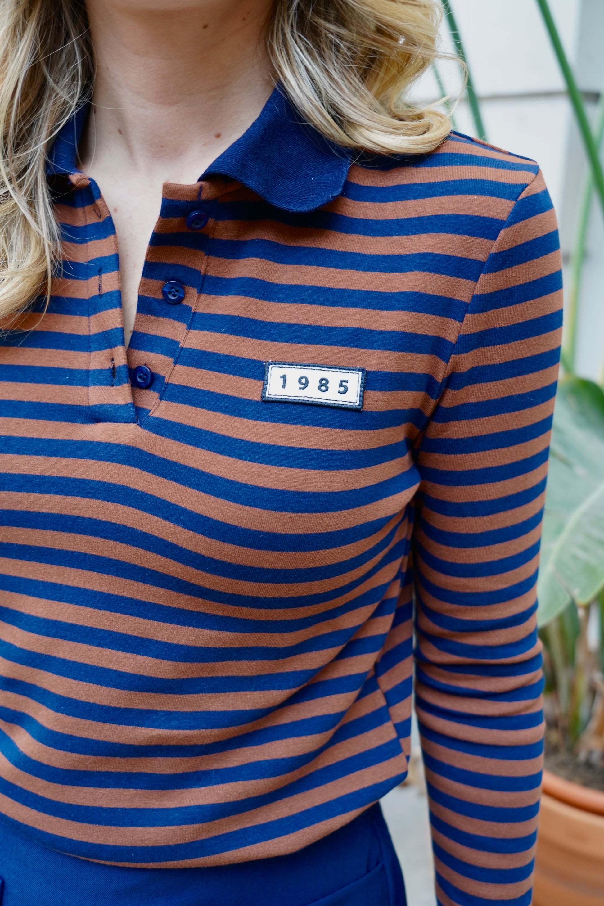 • Polo manches longues à rayures bleu marine et marron
