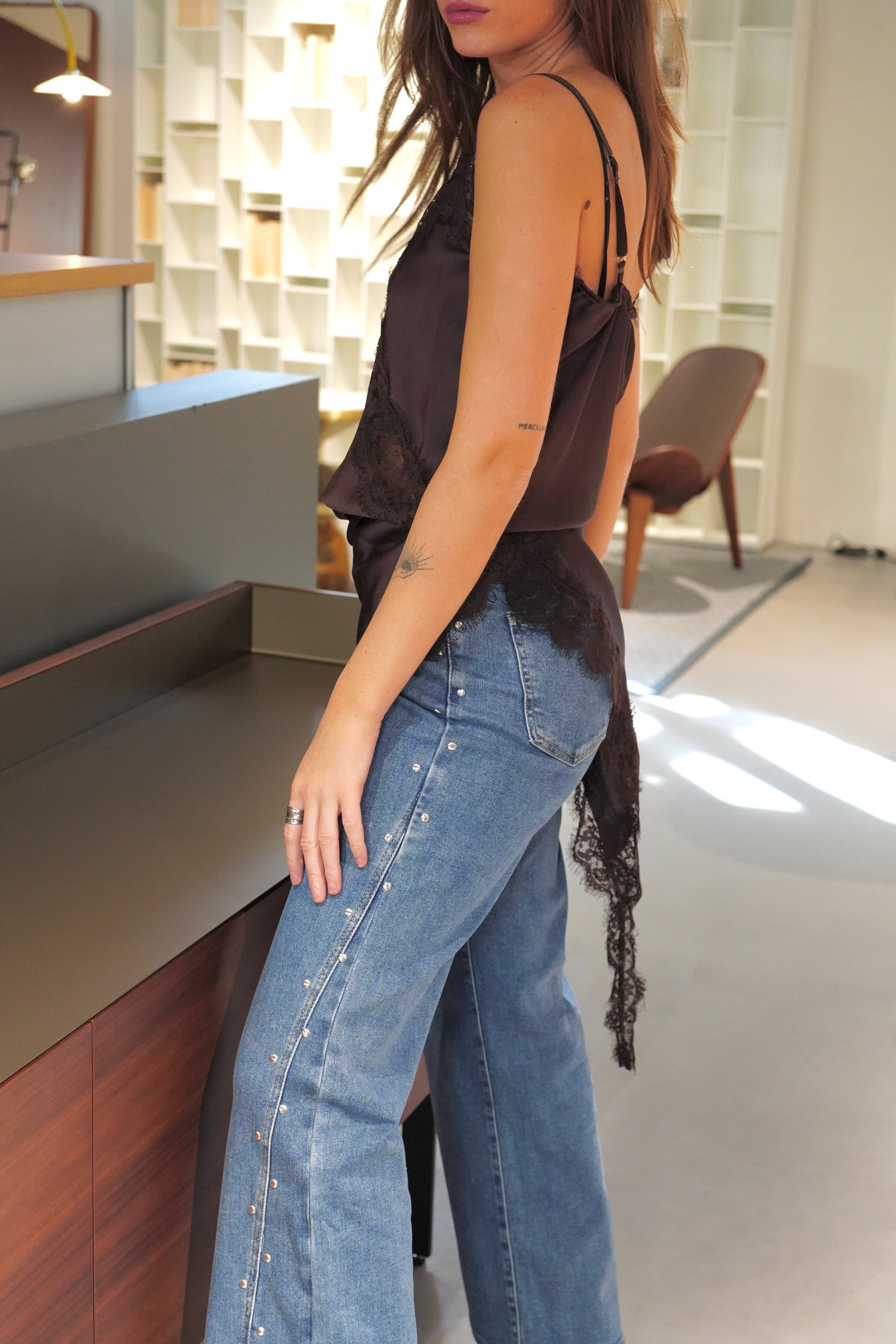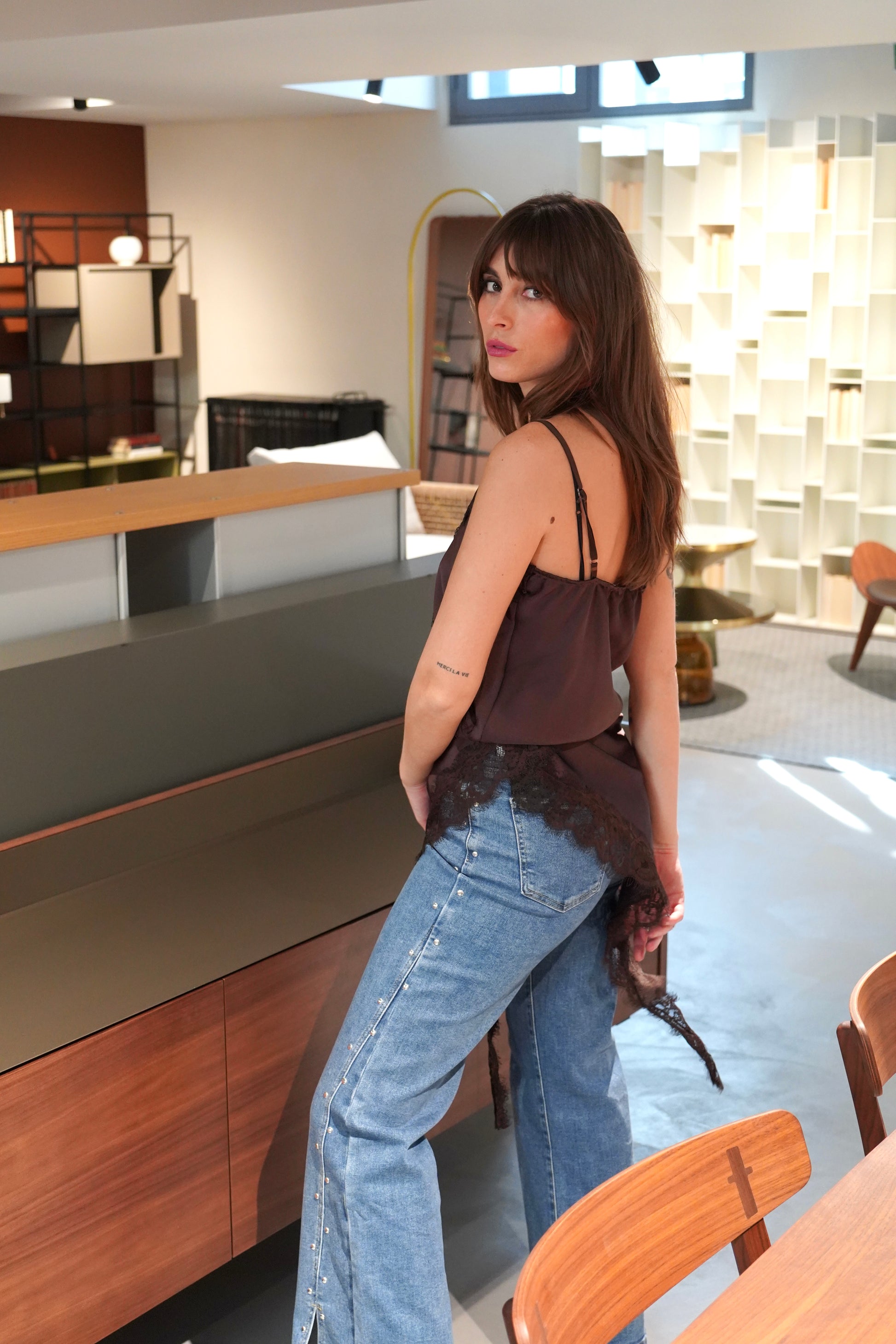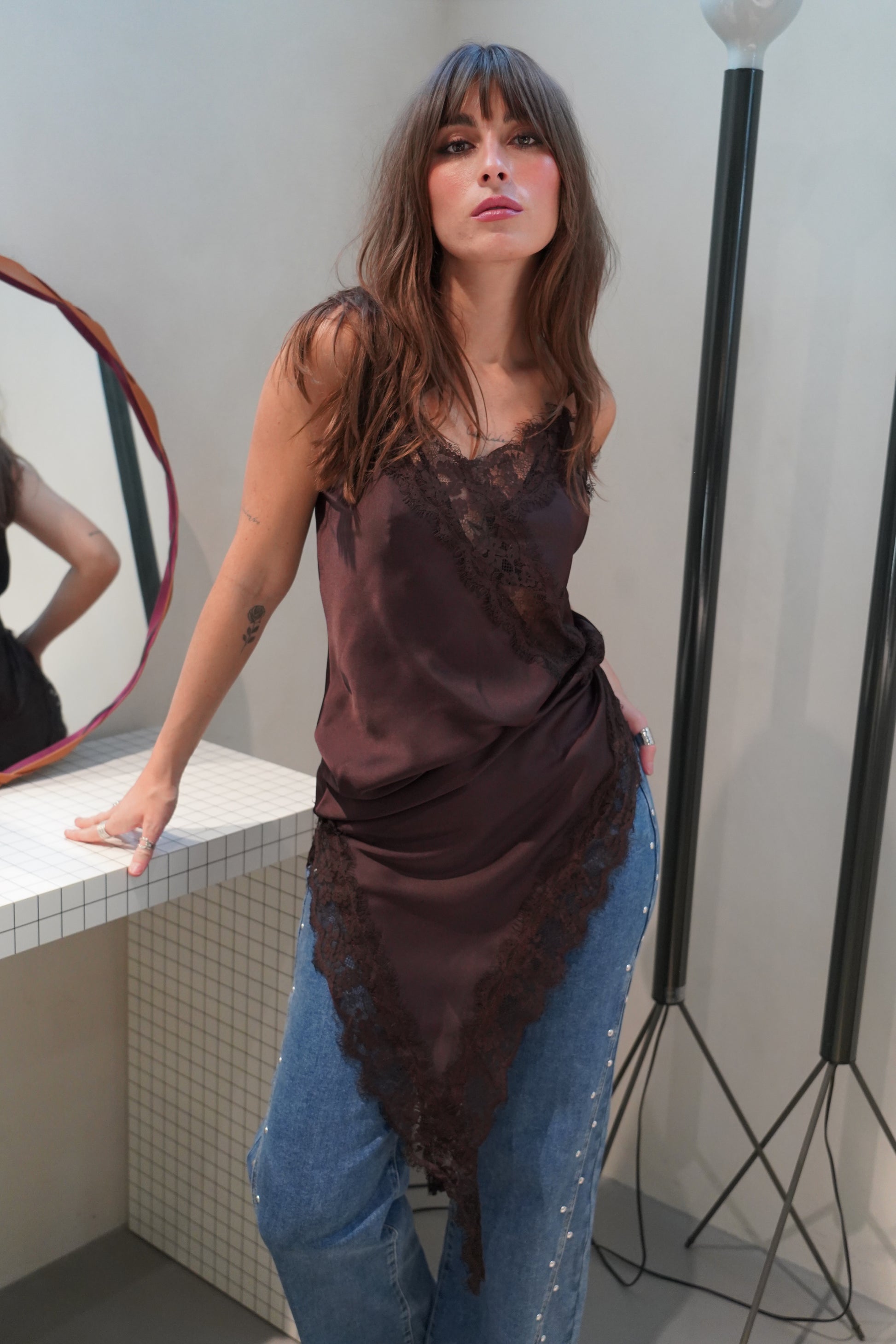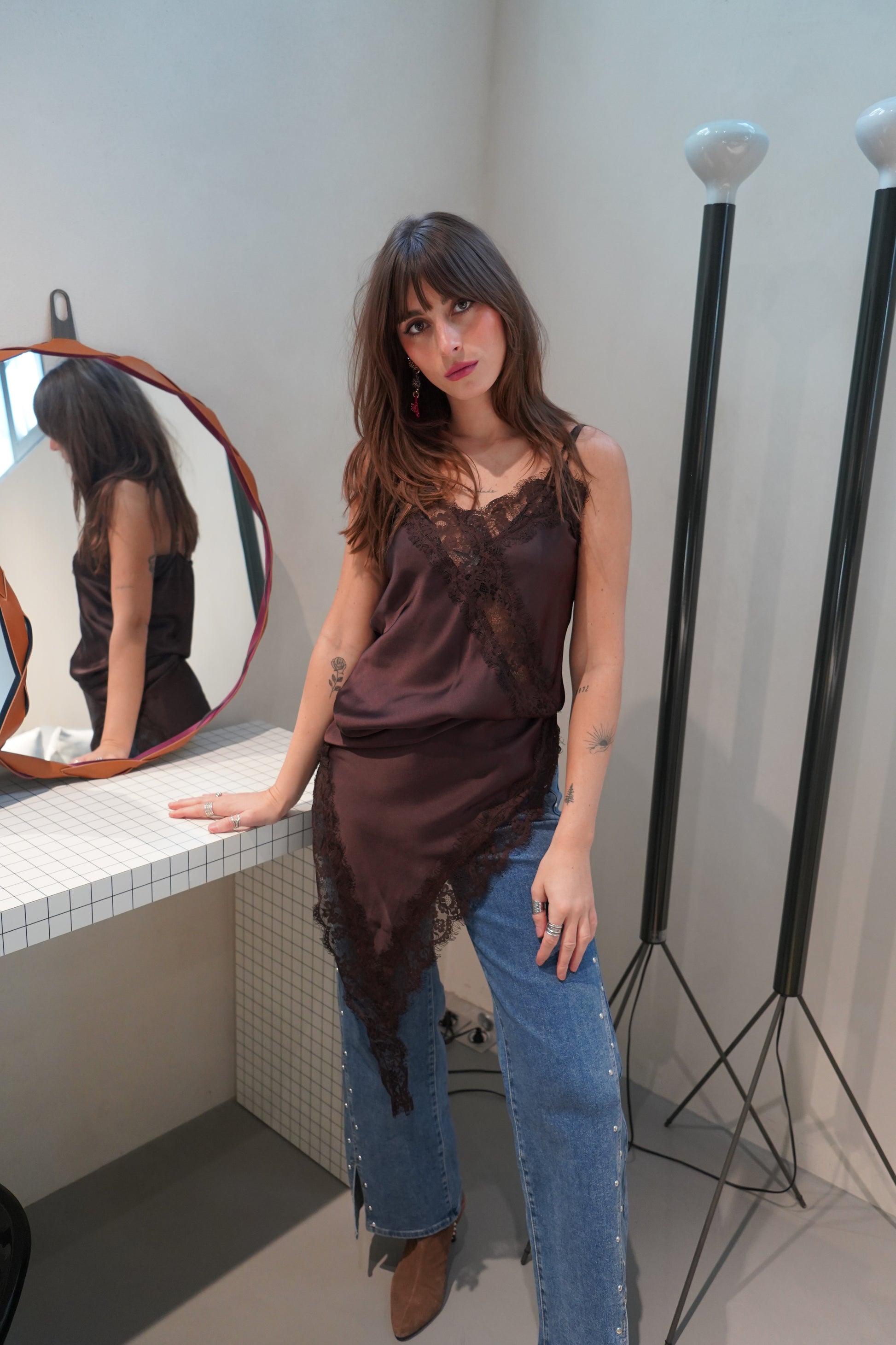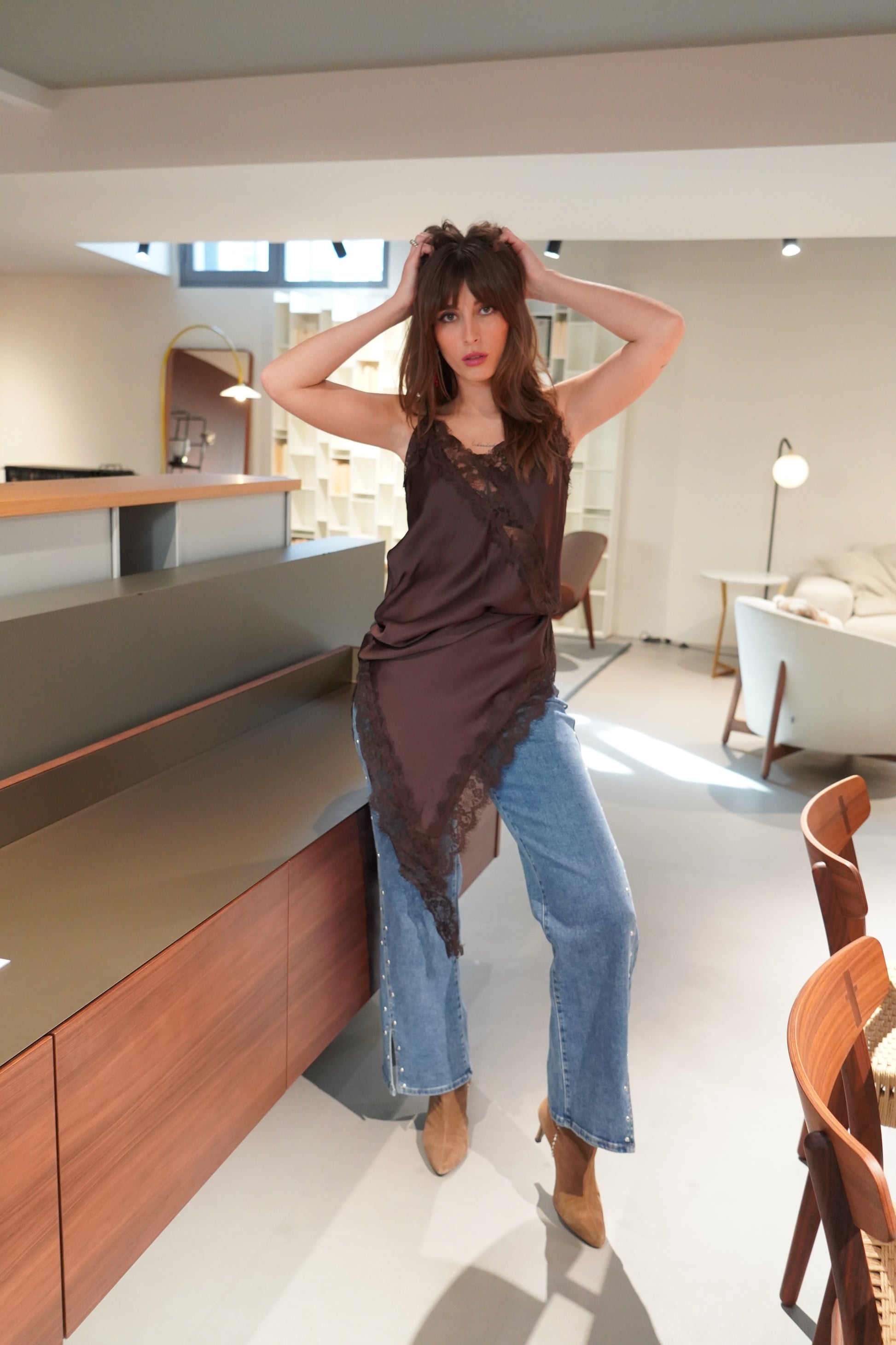 • Top satiné à bretelles fines façon caraco, ultra féminin et délicat